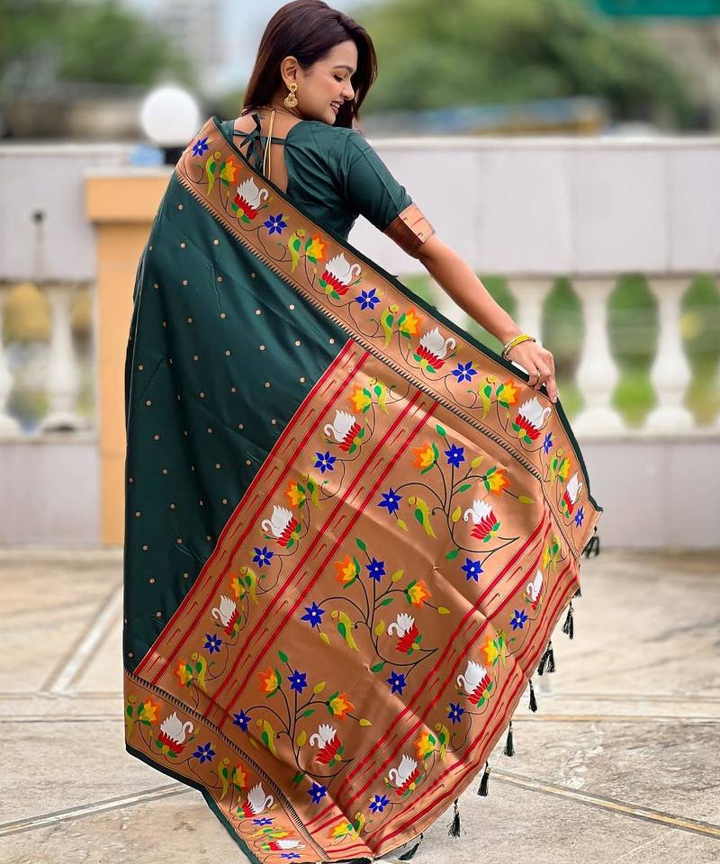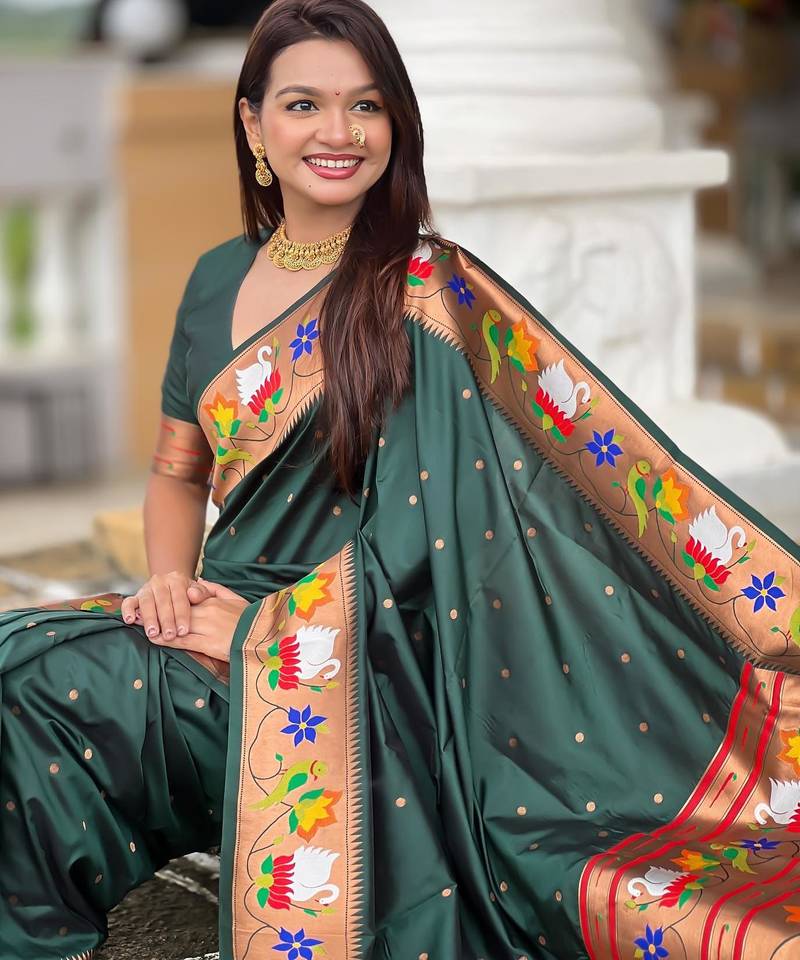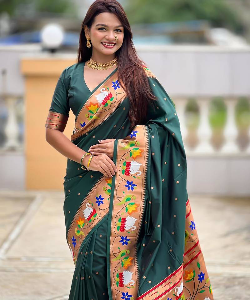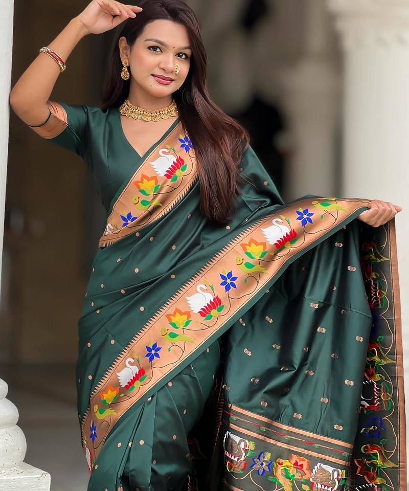 | Product Description | Soft Paithani Silk Saree With Zari Weawing Motifs Design And Meenakari Weawing Rich Pallu With Meenakari Weawing Border & Tassels Attached At Pallu End. Blouse : Enrich Silk Weawing Contrast Blouse Piece With Sleeve Border , |