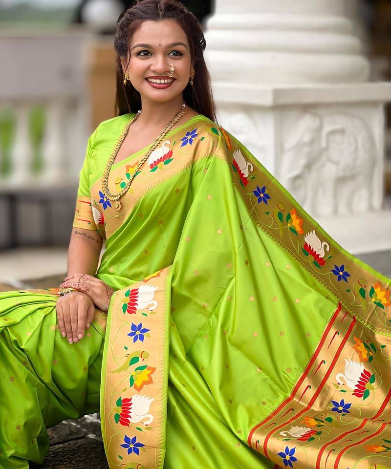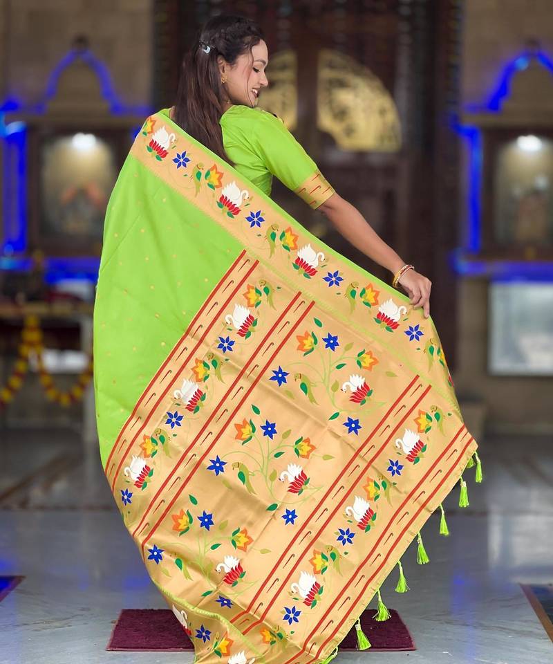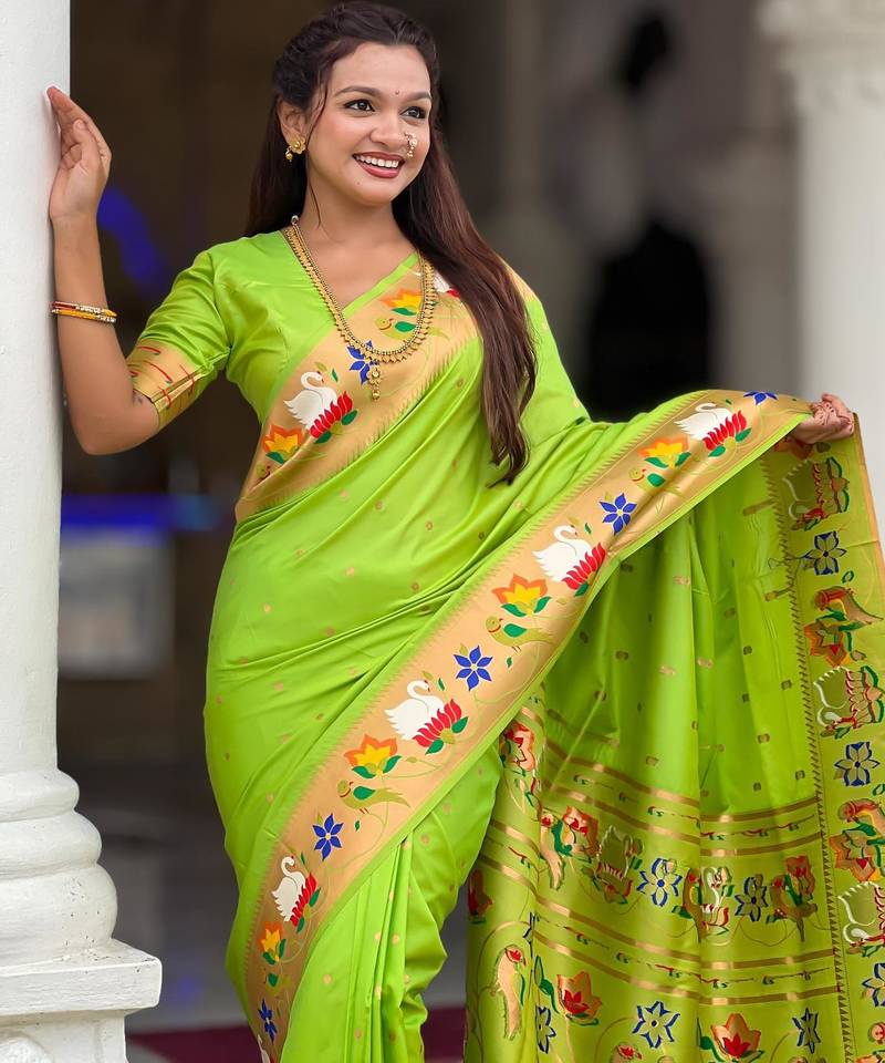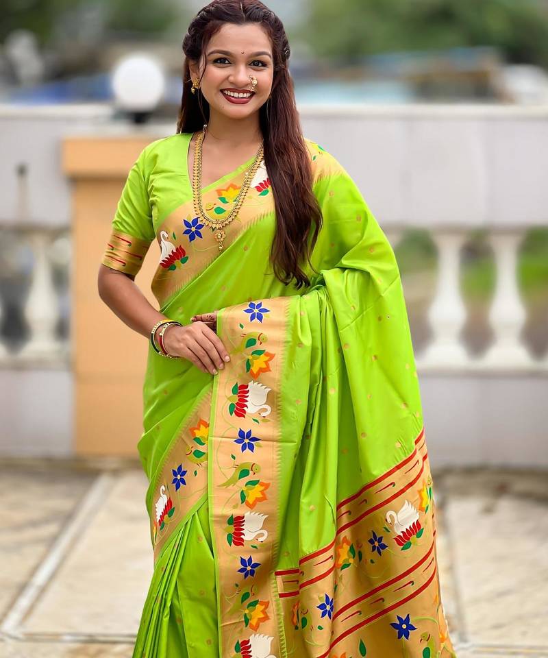 | Product Description | Soft Paithani Silk Saree With Zari Weawing Motifs Design And Meenakari Weawing Rich Pallu With Meenakari Weawing Border & Tassels Attached At Pallu End. Blouse : Enrich Silk Weawing Contrast Blouse Piece With Sleeve Border , |
