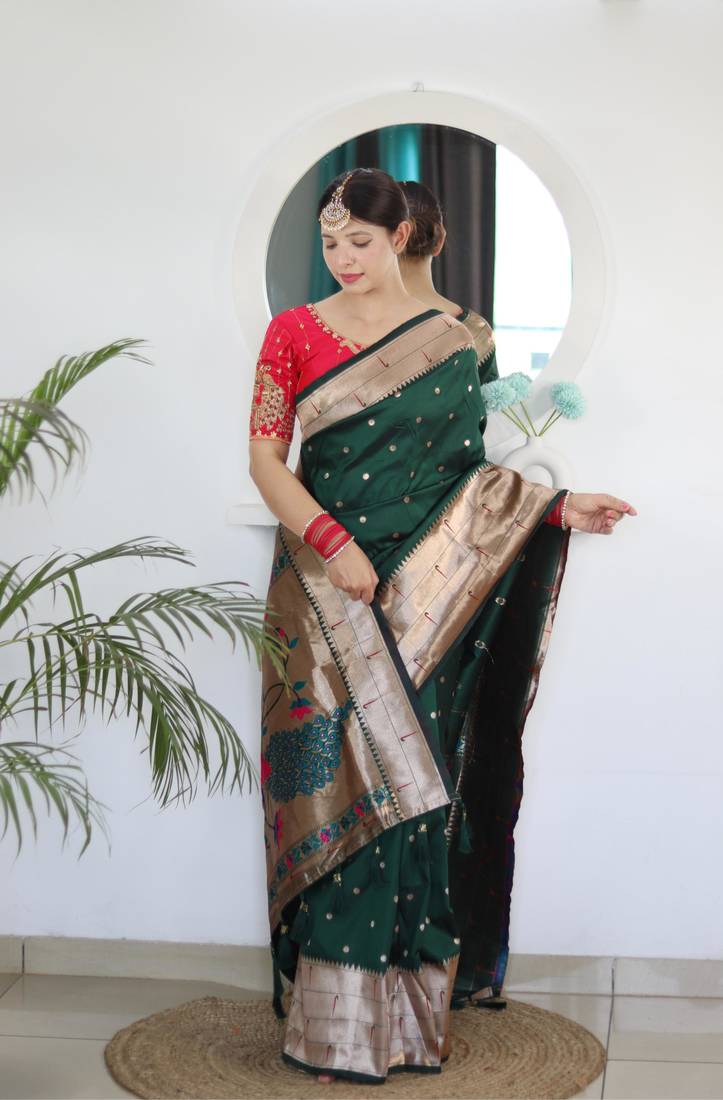 | Product Description | Soft Paithani Silk Saree With Zari Weawing Motifs Design And Meenakari Weawing Rich Pallu With Meenakari Weawing Border & Tassels Attached At Pallu End. Blouse : Enrich Silk Weawing Contrast Blouse Piece With Sleeve Border , |