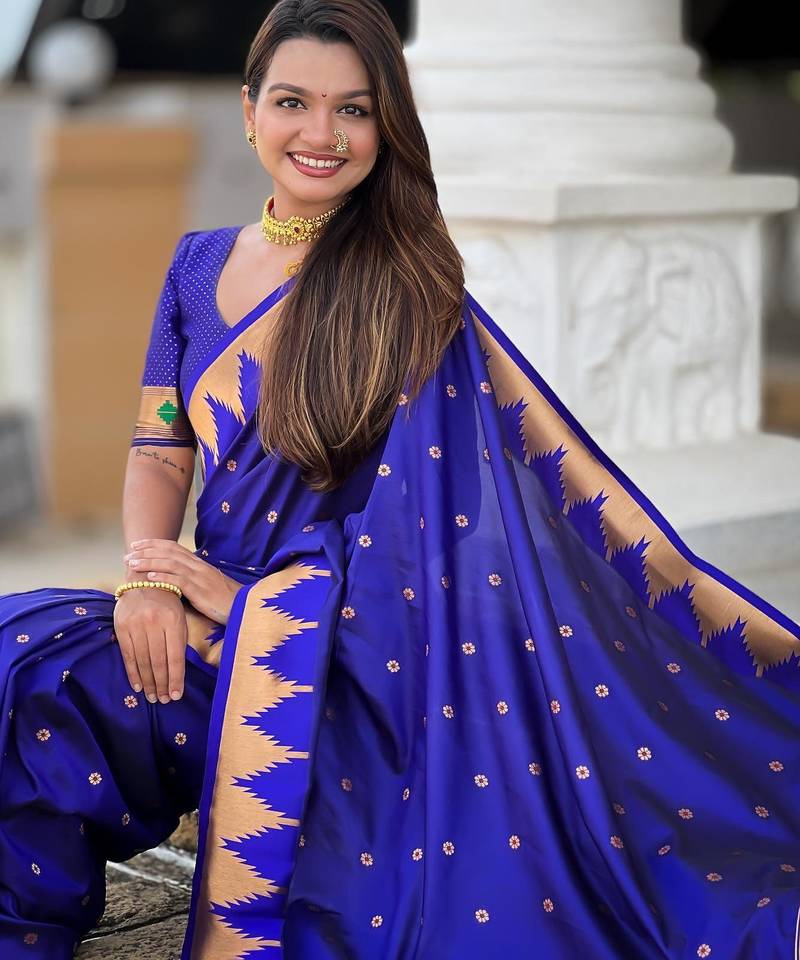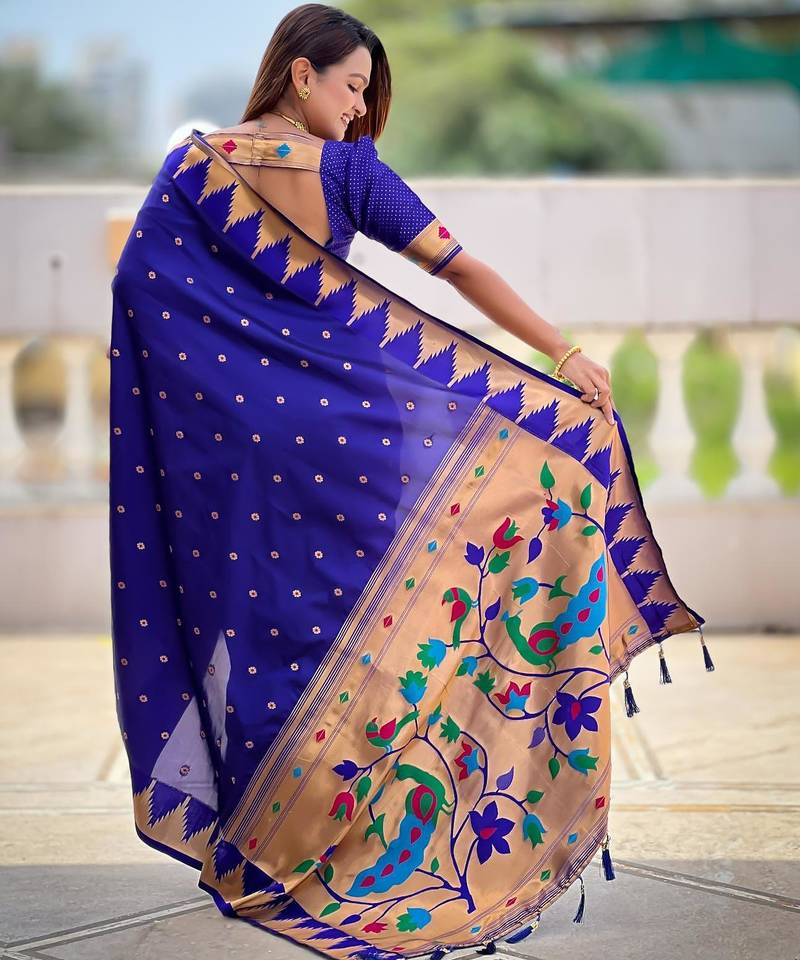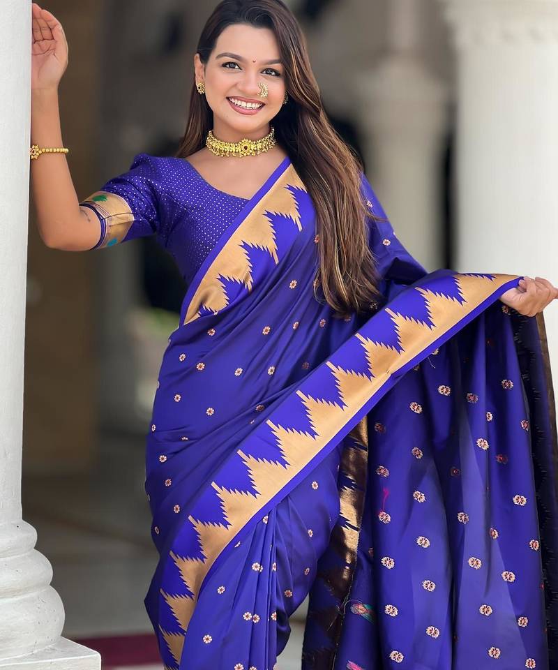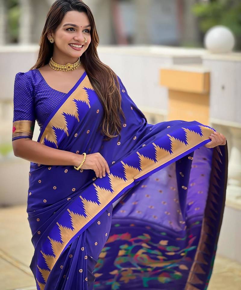 | Product Description | Soft Paithani Silk Saree With Zari Weawing Motifs Design And Meenakari Weawing Rich Pallu With Temple Weawing Border & Tassels Attached At Pallu End. Blouse : Enrich Silk Weawing Blouse Piece With Sleeve Border , |