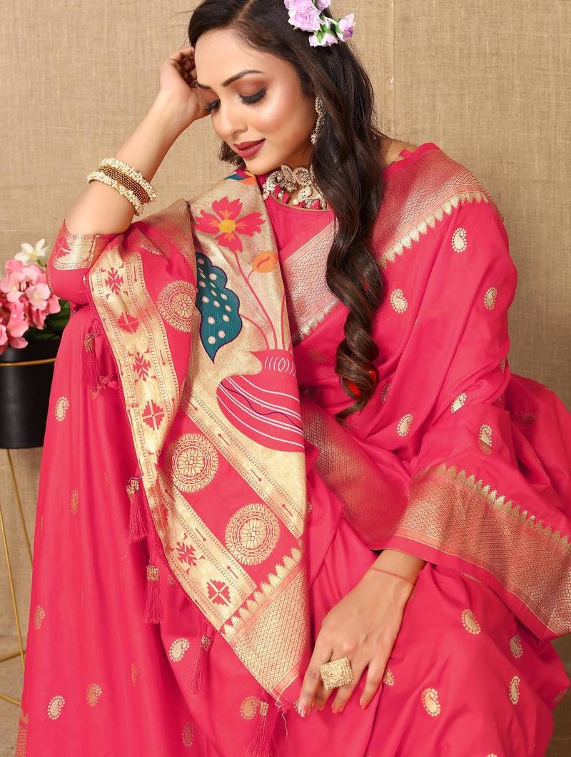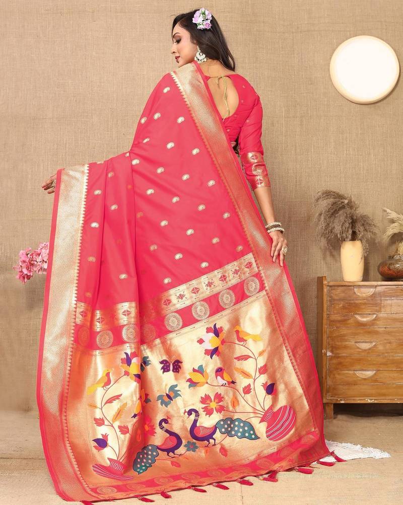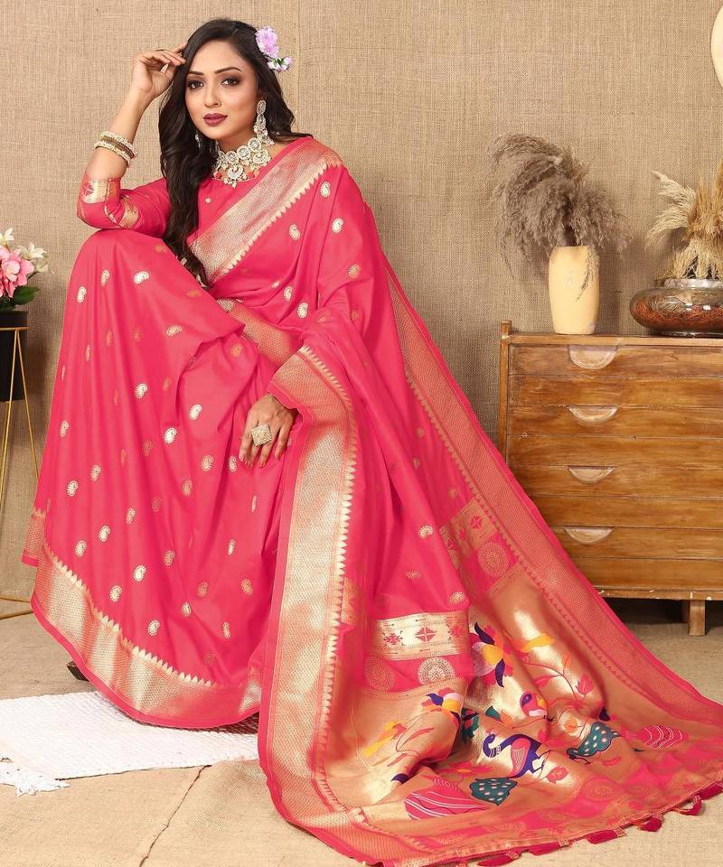 | Product Description | Soft Paithani Silk Saree With Zari Weawing Motifs Design And Meenakari Weawing Rich Pallu With Meenakari Weawing Border & Tassels Attached At Pallu End. Blouse : Enrich Silk Weawing Contrast Blouse Piece With Sleeve Border , |
