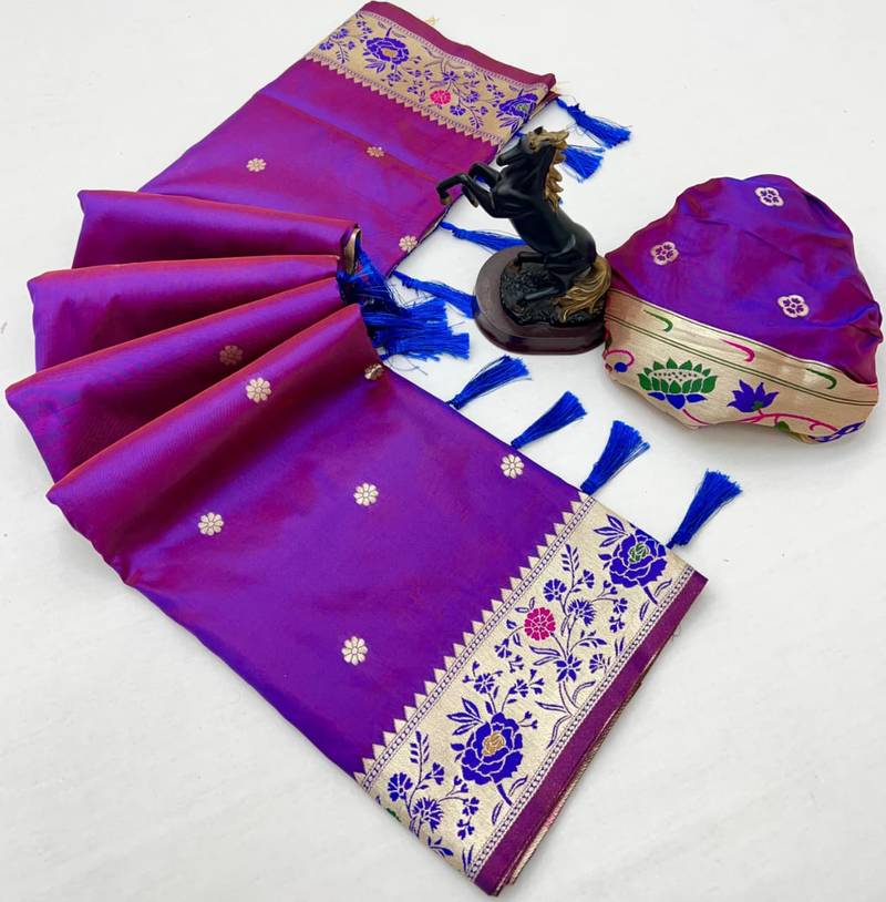 | Product Description | This Luxurious Paithani Saree Is Beautifully Crafted With Intricate Floral Zari Weaving Across The Body, Complemented By A Designer Floral Border. The Heavy Meenakari Woven Lotus Pallu Adds A Rich And Royal Touch, Making It An Ideal Choice For Weddings And Festive Occasions. |