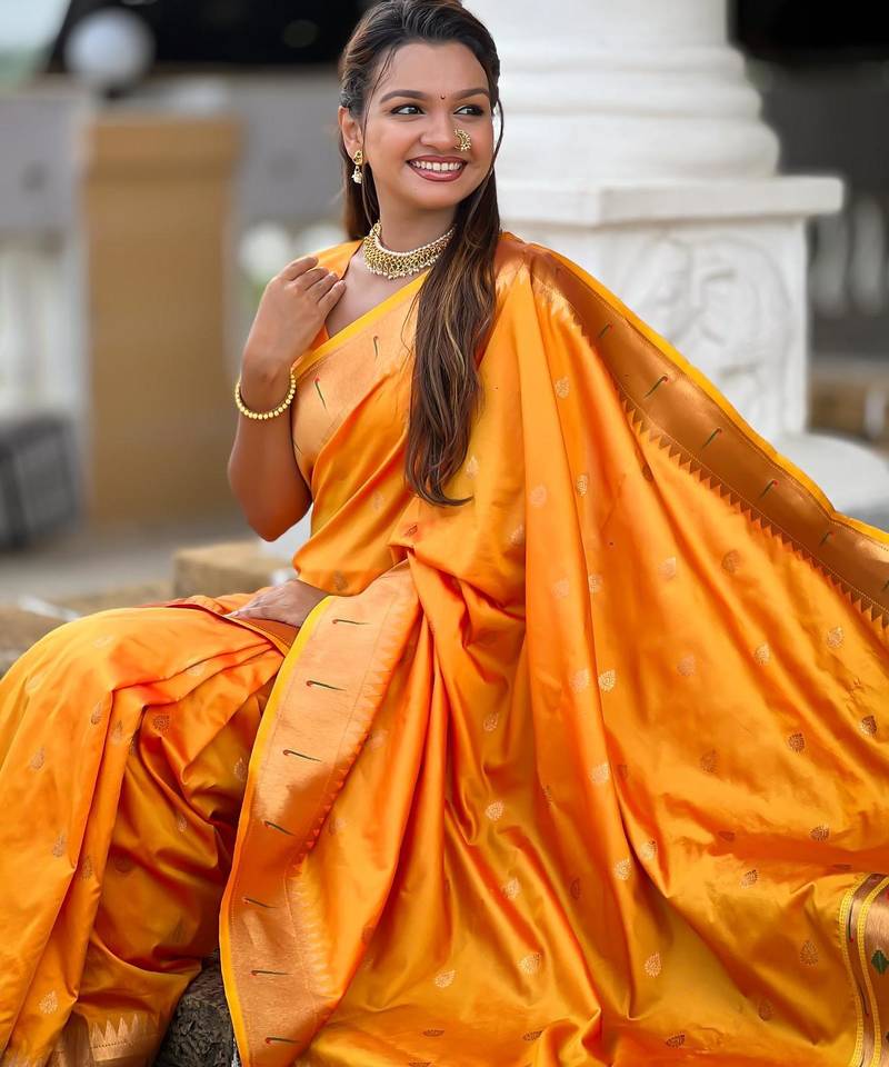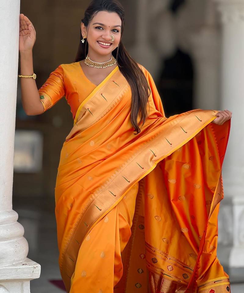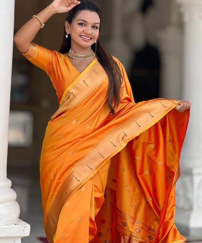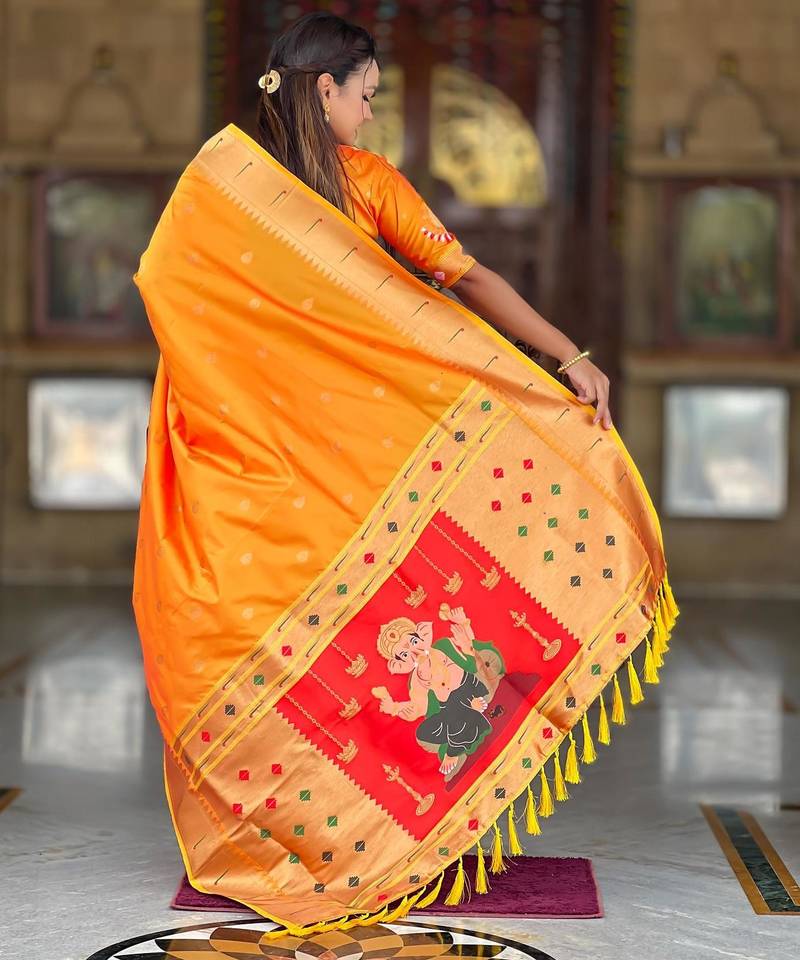 | Product Description | Soft Paithani Silk Saree With Zari Weawing Motifs Design And Meenakari Weawing Rich Pallu With Meenakari Weawing Munia Border & Tassels Attached At Pallu End. Blouse : Enrich Silk Weawing Contrast Blouse Piece With Sleeve Border , |