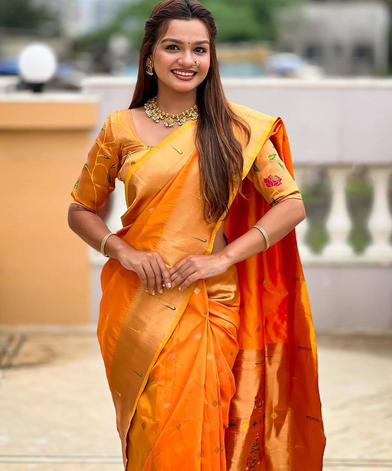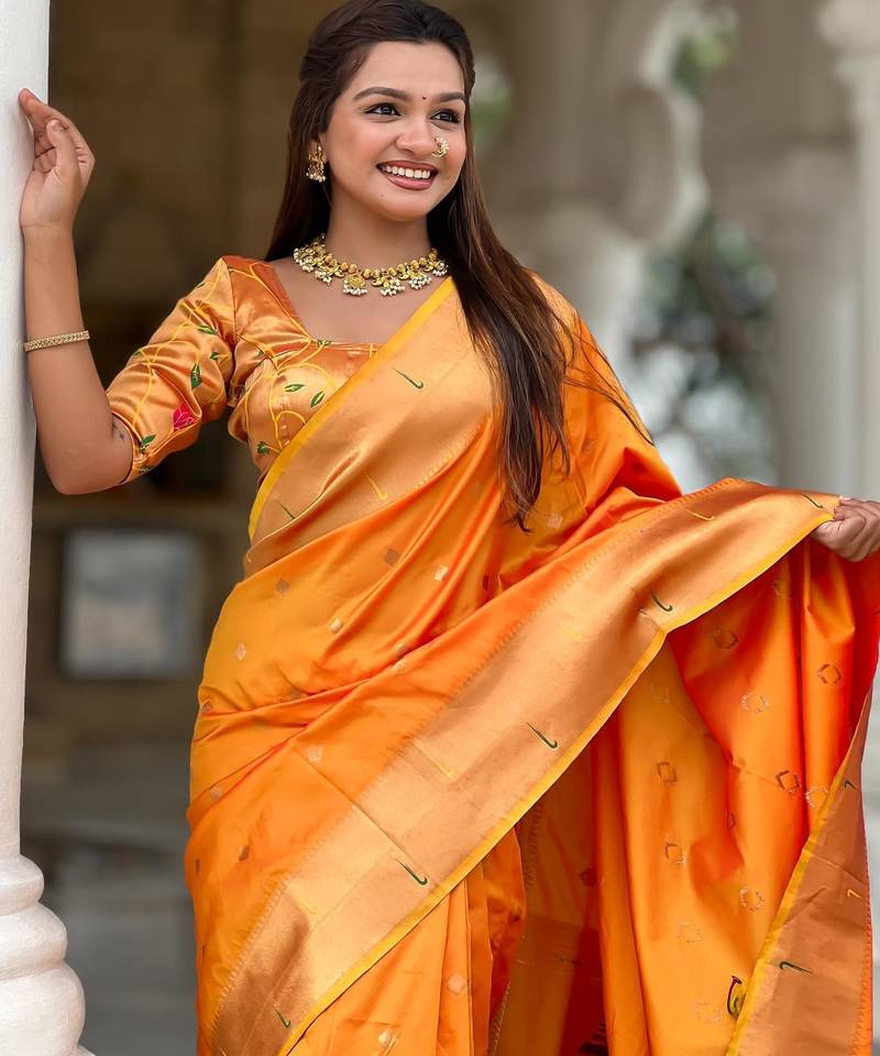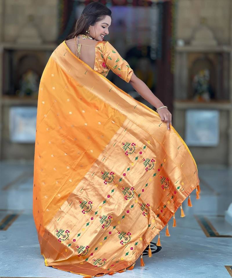 | Product Description | Soft Paithani Silk Saree With Zari Weawing Motifs Design And Meenakari Weawing Rich Pallu With Meenakari Weawing Double Munia Border & Tassels Attached At Pallu End. Blouse : Enrich Silk Weawing Blouse Piece With Sleeve Border , |
