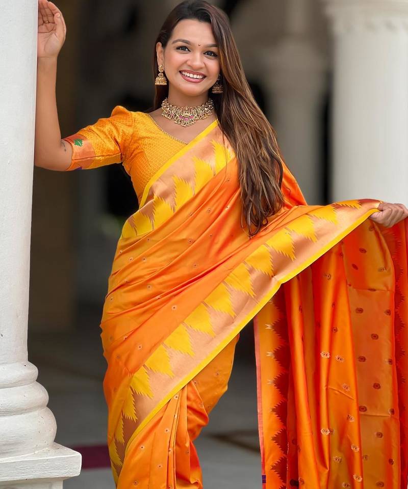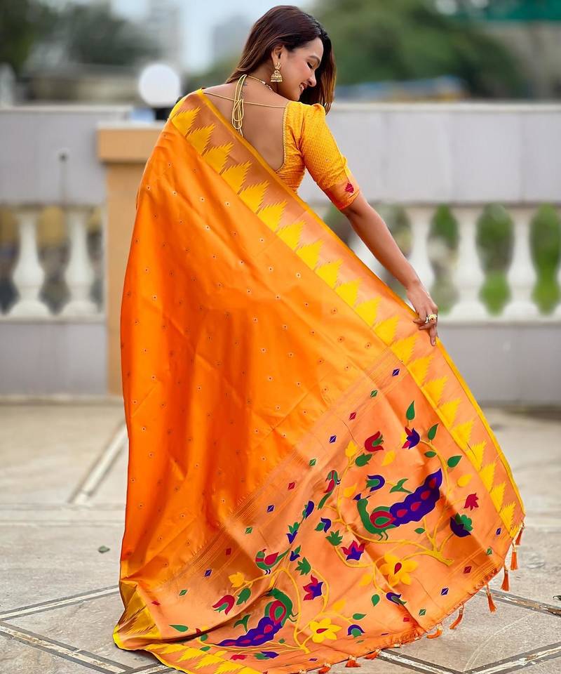 | Product Description | Soft Paithani Silk Saree With Zari Weawing Motifs Design And Meenakari Weawing Rich Pallu With Temple Weawing Border & Tassels Attached At Pallu End. Blouse : Enrich Silk Weawing Blouse Piece With Sleeve Border , |