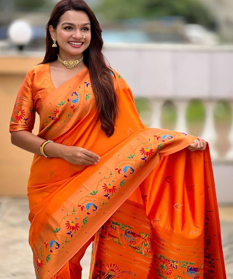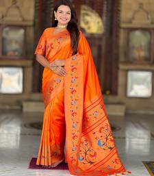 Orange elegant art silk woven saree with rich zari border