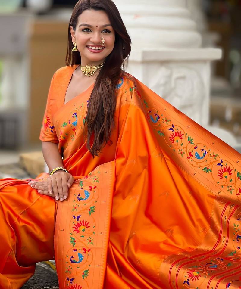 | Product Description | Soft Paithani Silk Saree With Zari Weawing Meenakari Motifs Design And Meenakari Weawing Rich Pallu With Meenakari Weawing Border & Tassels Attached At Pallu End. Blouse : Enrich Silk Weawing Contrast Blouse Piece With Sleeve Border , |