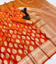 Orange soft silk saree with zari butti design & rich woven pallu