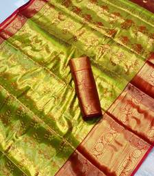 Parrot green silk saree with contrast zari border & rich woven pallu