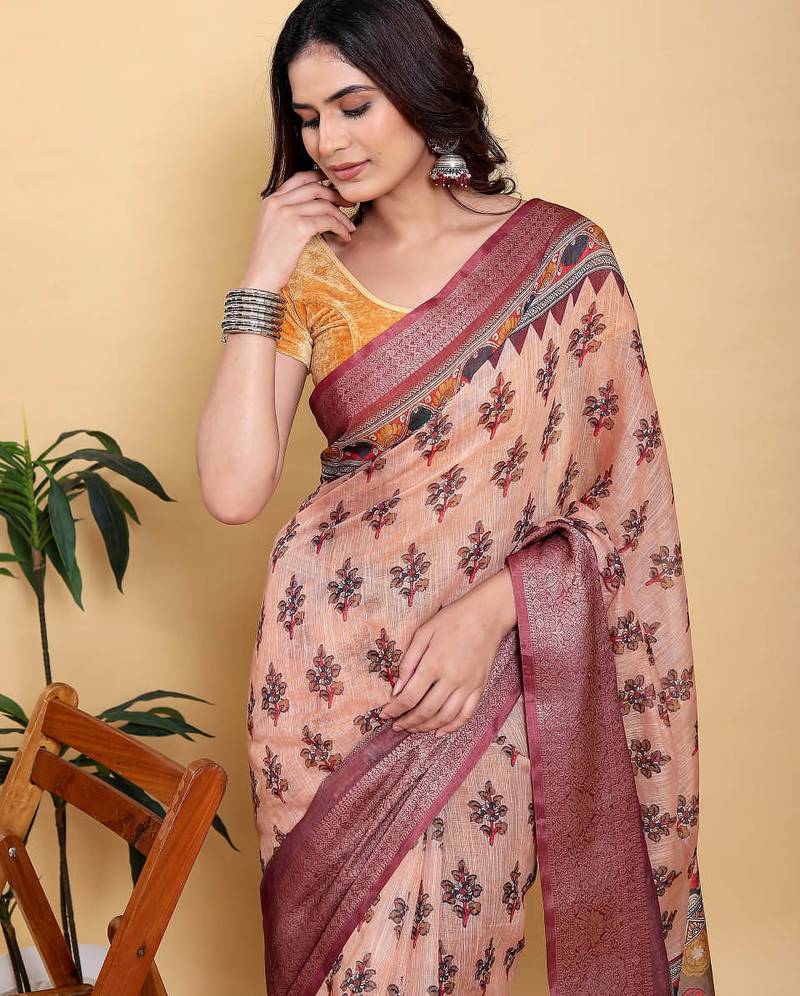 Product Name Peach Printed Art Silk Designer Pallu Saree