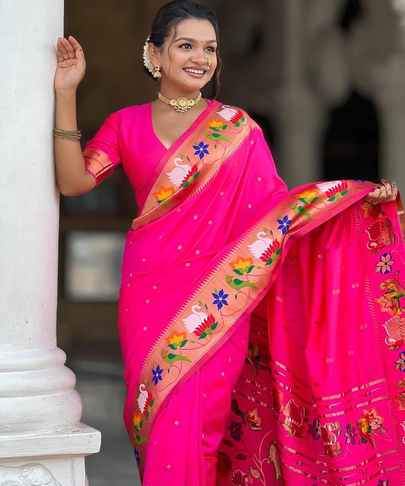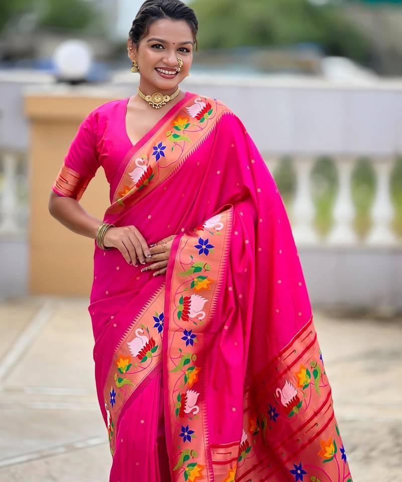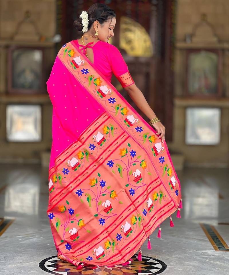 | Product Description | Soft Paithani Silk Saree With Zari Weawing Motifs Design And Meenakari Weawing Rich Pallu With Meenakari Weawing Border & Tassels Attached At Pallu End. Blouse : Enrich Silk Weawing Contrast Blouse Piece With Sleeve Border , |