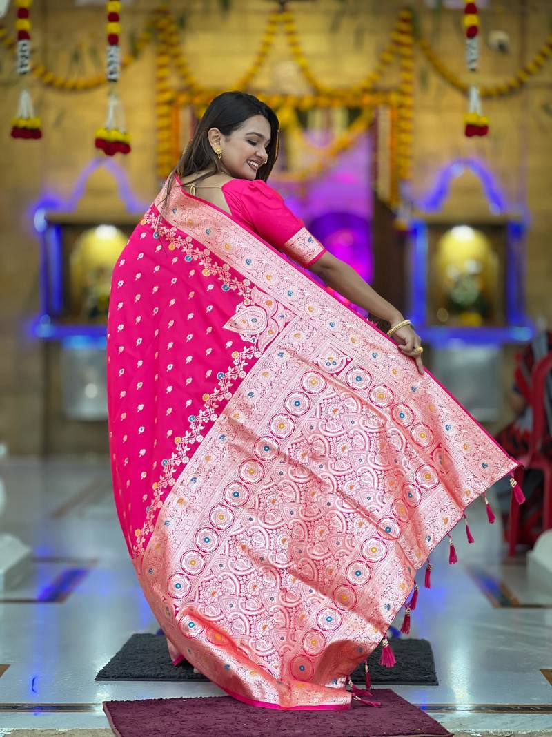| Product Description | Soft Banarasi Silk Saree With Zari Weaving Meenakari Touchup Design All Over The Saree & Meenakari Weawing Rich Pallu With Meenakari Weawing Border & Tessels Attached At Pallu End. Blouse : Soft Silk Weawing Blouse Piece |