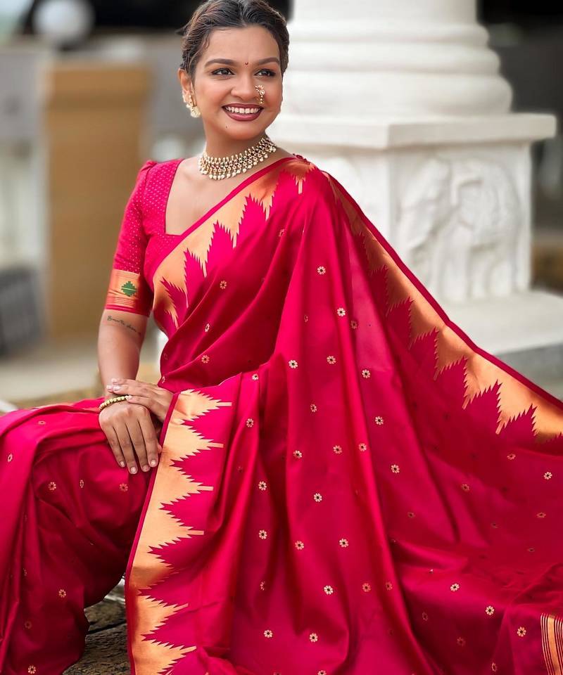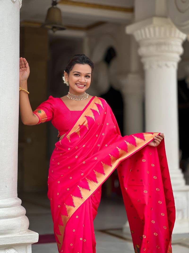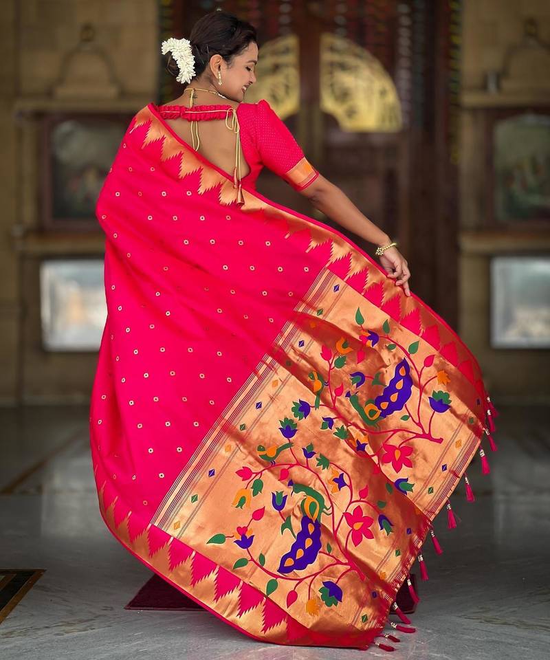 | Product Description | Soft Paithani Silk Saree With Zari Weawing Motifs Design And Meenakari Weawing Rich Pallu With Temple Weawing Border & Tassels Attached At Pallu End. Blouse : Enrich Silk Weawing Blouse Piece With Sleeve Border , |