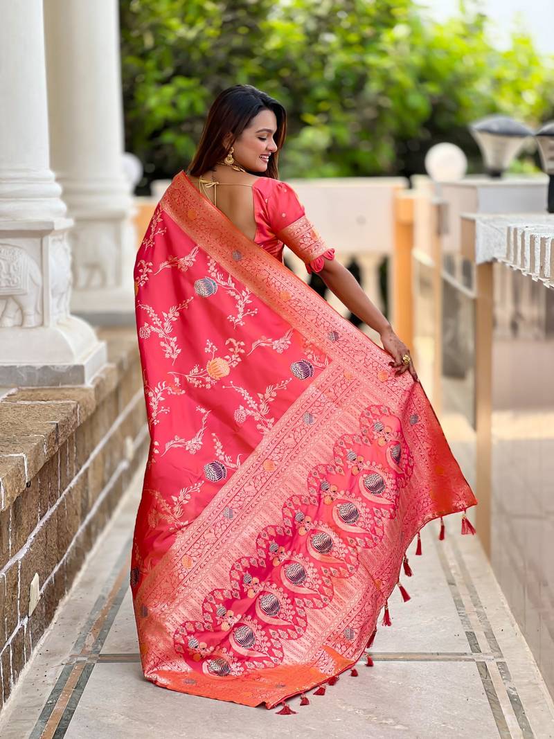 | Product Description | Soft Banarasi Silk Saree With Zari Weaving Meenakari Touchup Design All Over The Saree & Meenakari Weawing Rich Pallu With Meenakari Weawing Border & Tessels Attached At Pallu End. Blouse : Soft Silk Weawing Blouse Piece |
