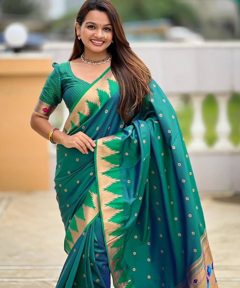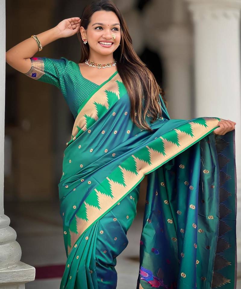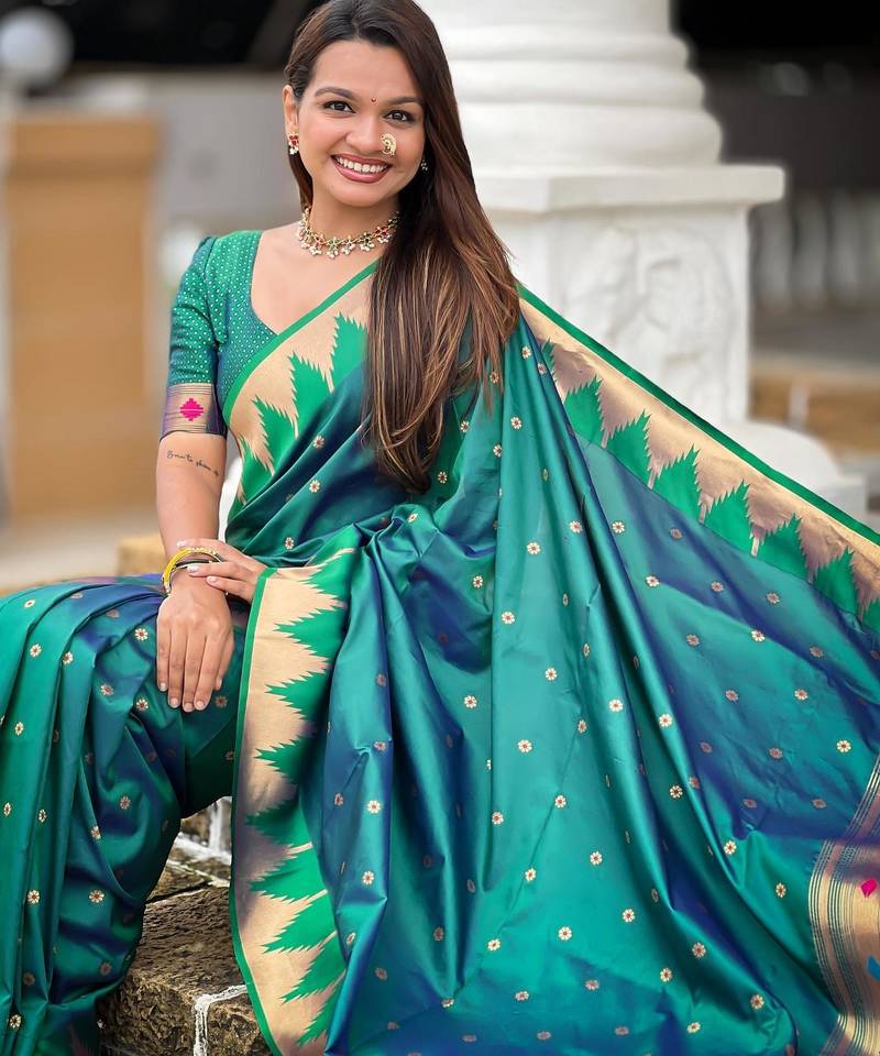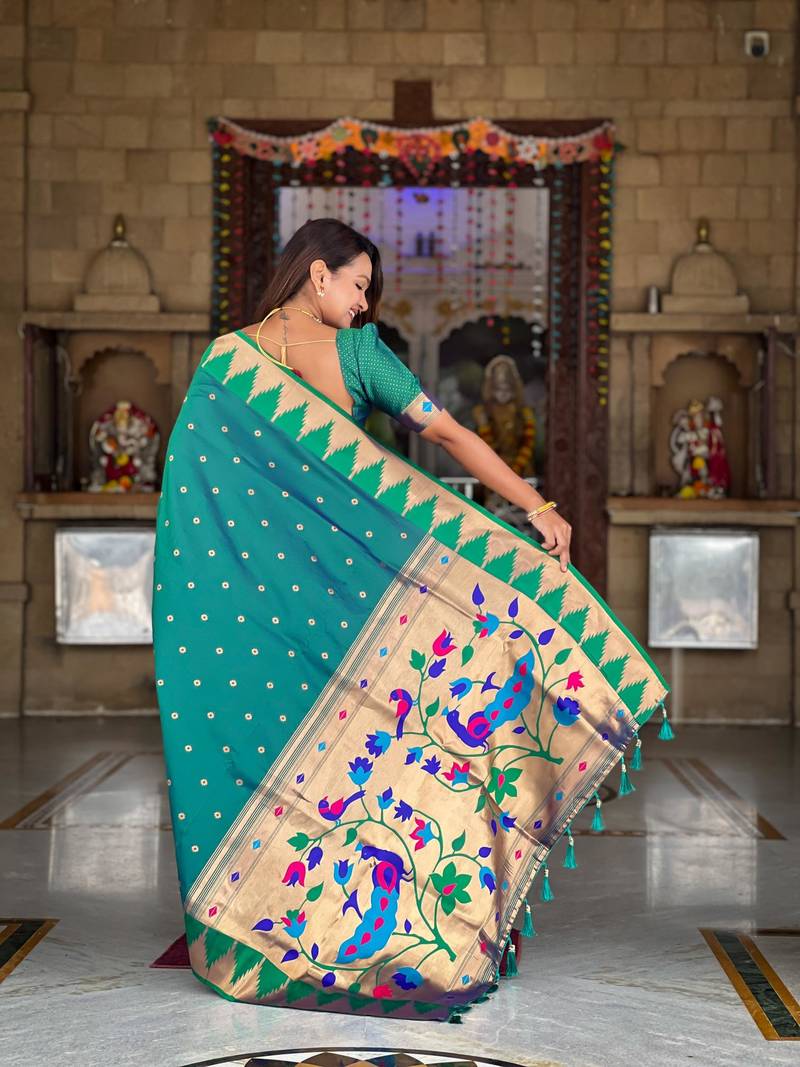 | Product Description | Soft Paithani Silk Saree With Zari Weawing Motifs Design And Meenakari Weawing Rich Pallu With Temple Weawing Border & Tassels Attached At Pallu End. Blouse : Enrich Silk Weawing Blouse Piece With Sleeve Border , |