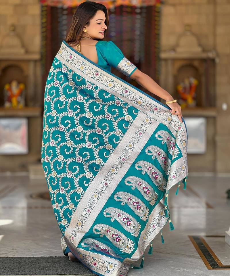 | Product Description | Soft Banarasi Silk Saree With Zari Weaving Meenakari Touchup Design All Over The Saree & Meenakari Weawing Rich Pallu With Meenakari Weawing Border & Tessels Attached At Pallu End. Blouse : Soft Silk Weawing Blouse Piece |