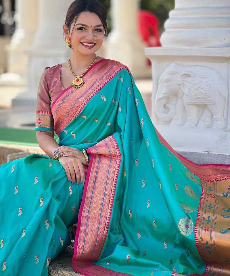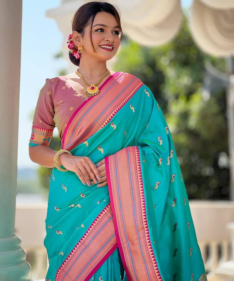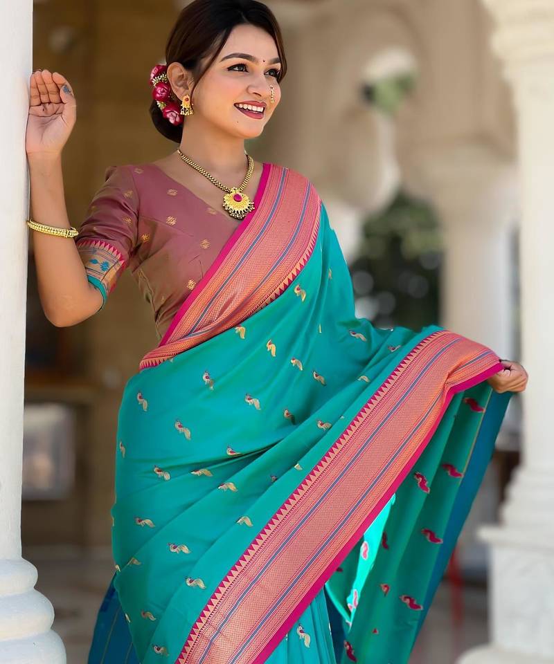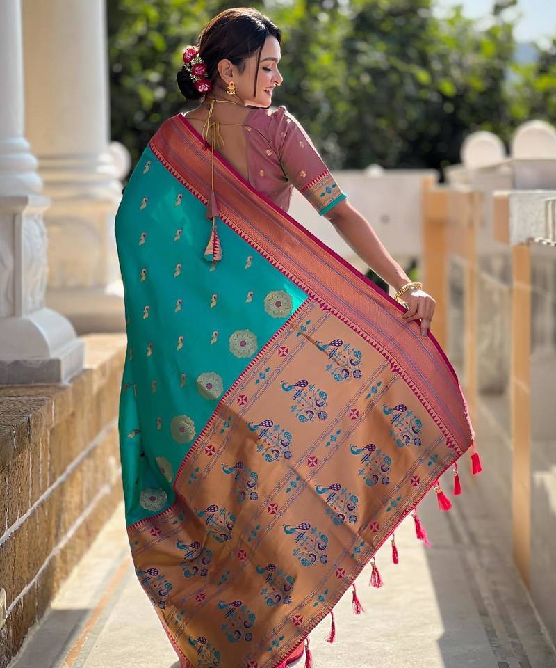 | Product Description | Soft Paithani Silk Saree With Zari Weawing Motifs Design And Meenakari Weawing Rich Pallu With Meenakari Weawing Border & Tassels Attached At Pallu End. Blouse : Enrich Silk Weawing Contrast Blouse Piece With Sleeve Border , |