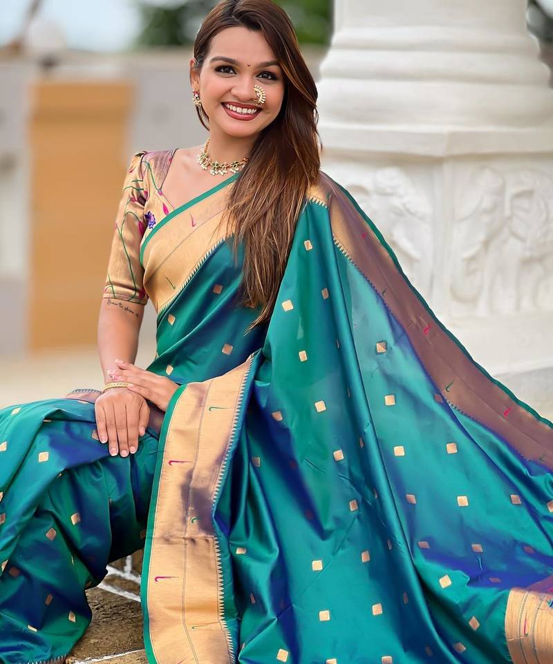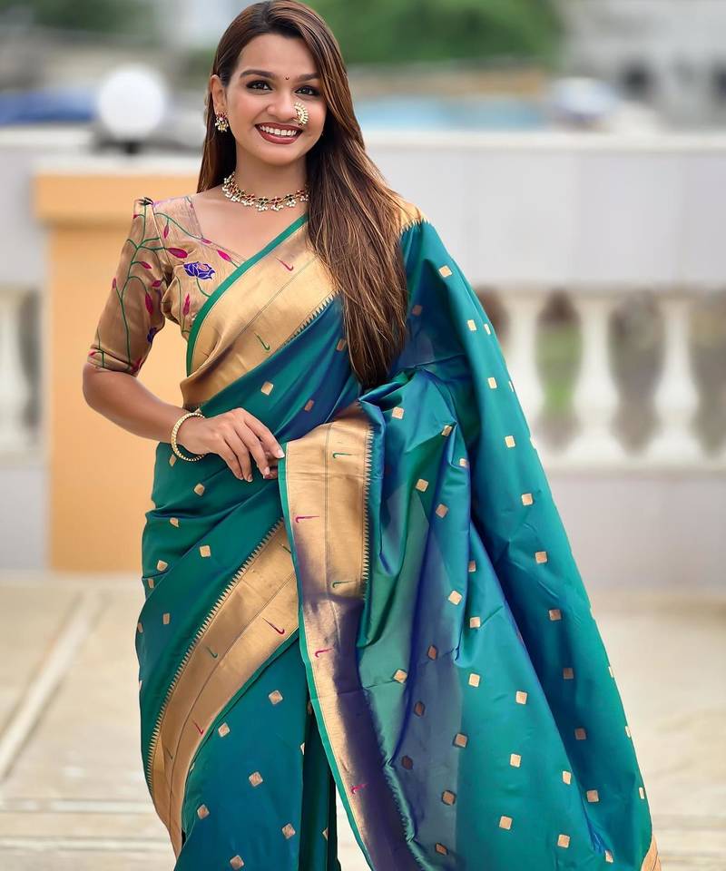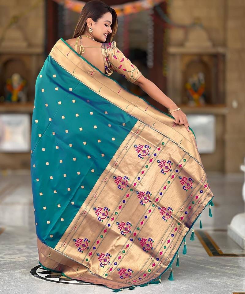 | Product Description | Soft Paithani Silk Saree With Zari Weawing Motifs Design And Meenakari Weawing Rich Pallu With Meenakari Weawing Double Munia Border & Tassels Attached At Pallu End. Blouse : Enrich Silk Weawing Blouse Piece With Sleeve Border , |