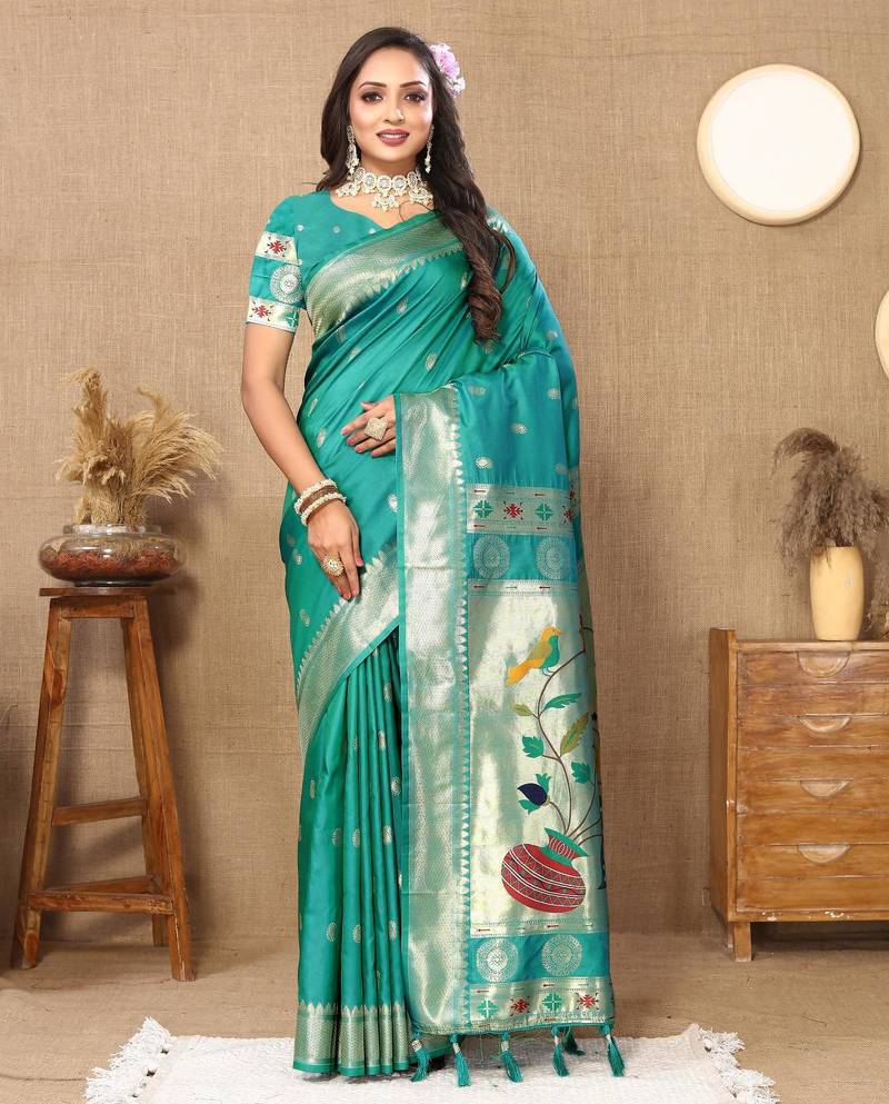 | Product Description | Soft Paithani Silk Saree With Zari Weawing Motifs Design And Meenakari Weawing Rich Pallu With Meenakari Weawing Border & Tassels Attached At Pallu End. Blouse : Enrich Silk Weawing Contrast Blouse Piece With Sleeve Border , |