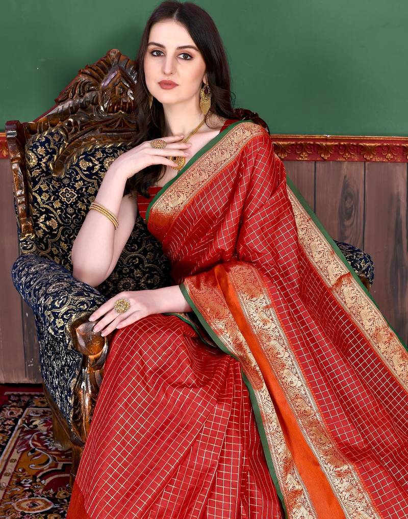 Red elegant art silk woven saree with rich zari border