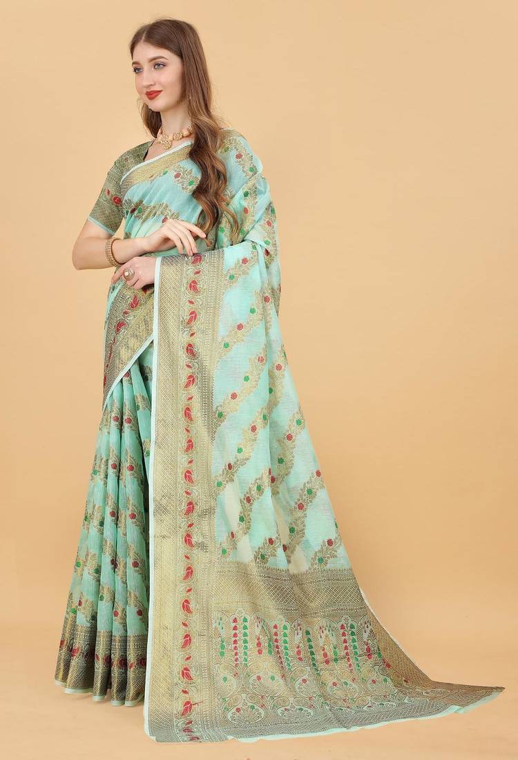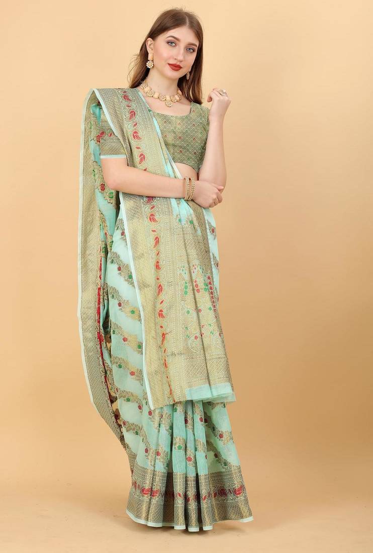 | Product Description | Soft Cotton Saree With Zari Weawing Design And Rich Zari Weawing Pallu With Zari Weawing Border , Blouse : Silk Weawing Blouse Piece |
