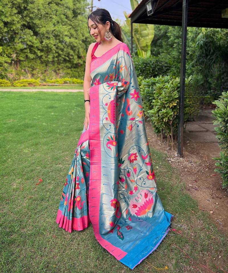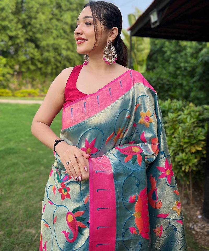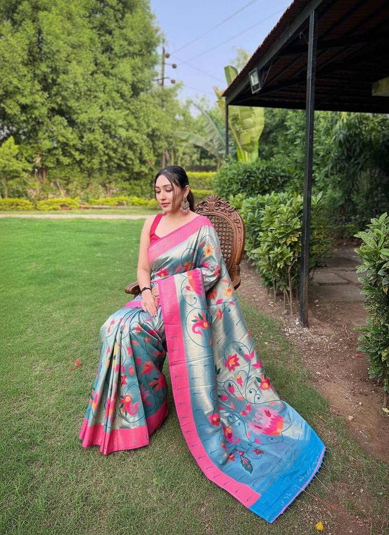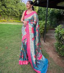 Teal art silk woven saree