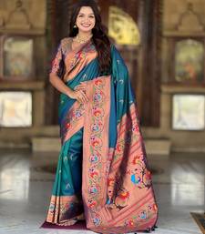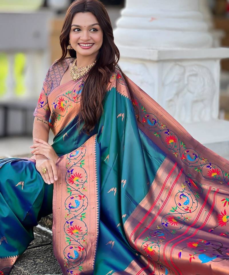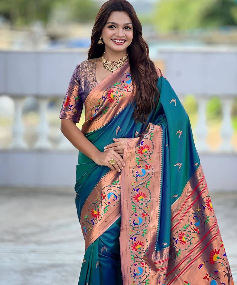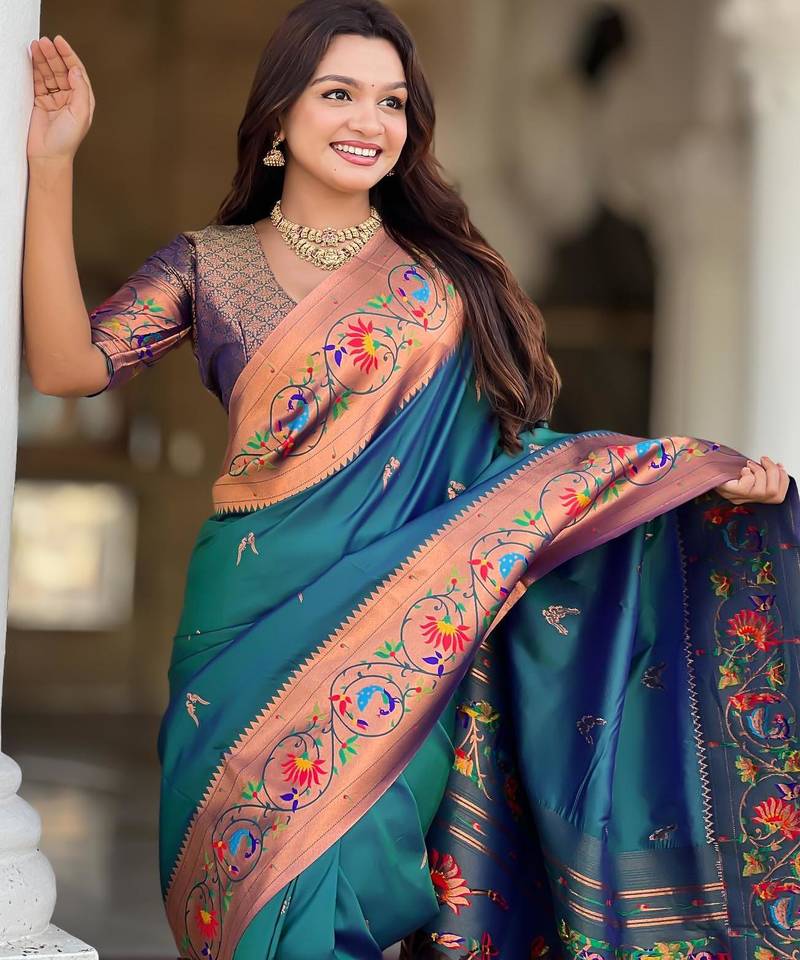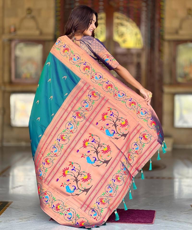 | Product Description | Soft Paithani Silk Saree With Zari Weawing Meenakari Motifs Design And Meenakari Weawing Rich Pallu With Meenakari Weawing Border & Tassels Attached At Pallu End. Blouse : Enrich Silk Weawing Contrast Blouse Piece With Sleeve Border , |