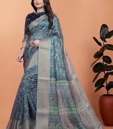 Teal printed art silk designer pallu saree