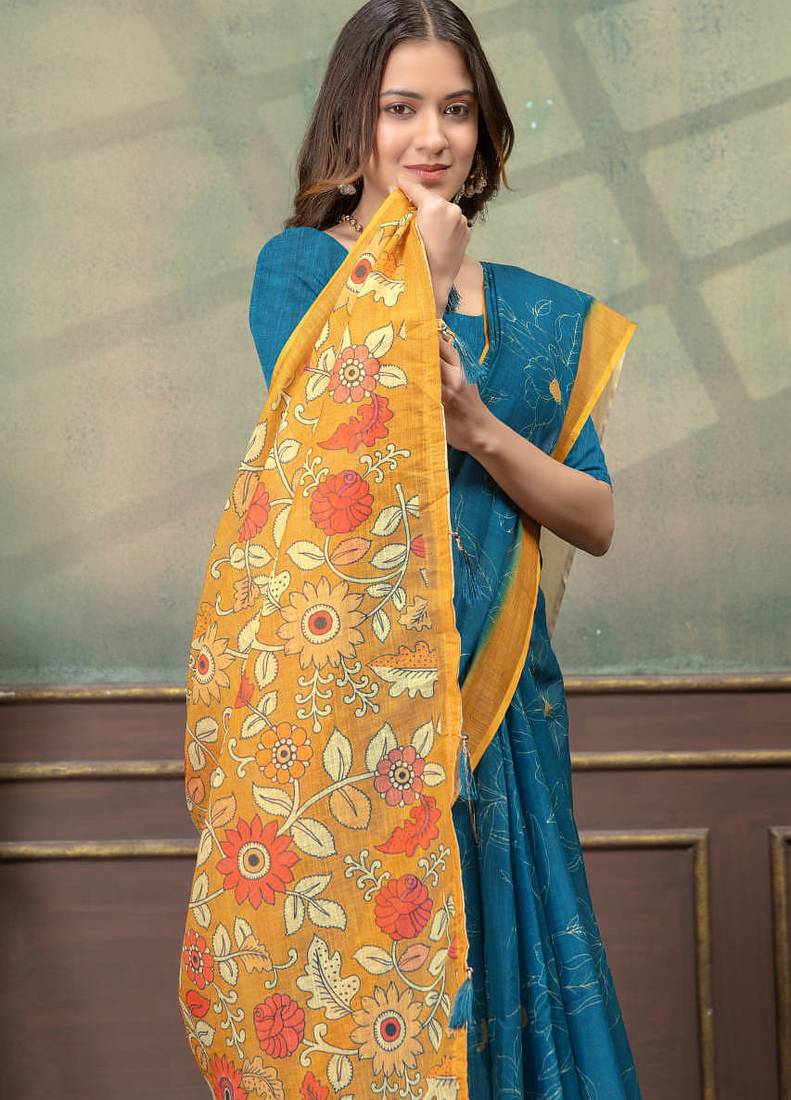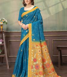 Teal printed art silk designer pallu saree