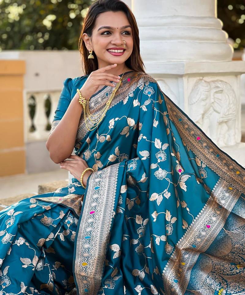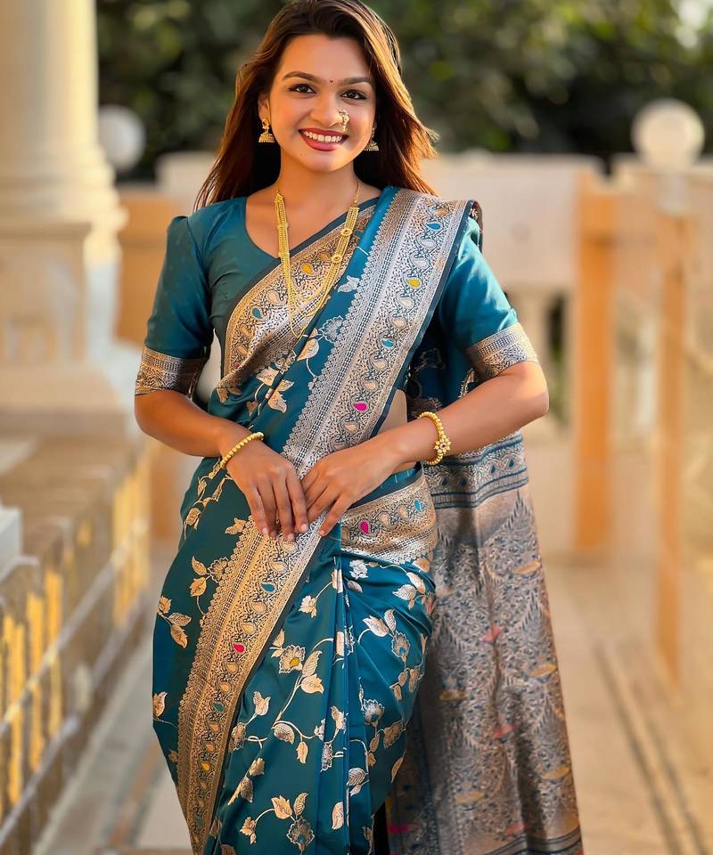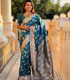 Turquoise elegant art silk woven saree with rich zari border