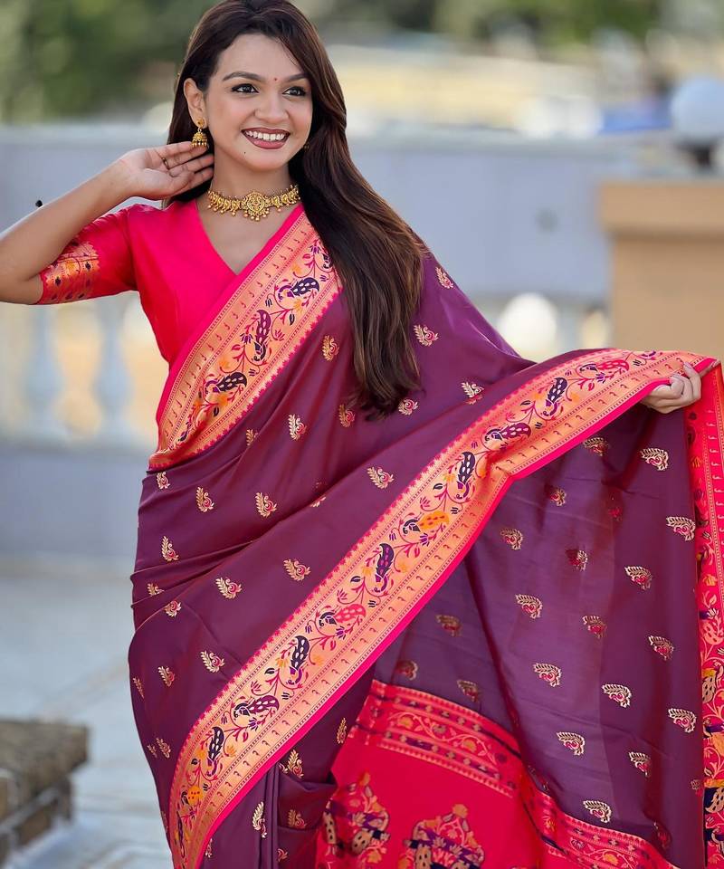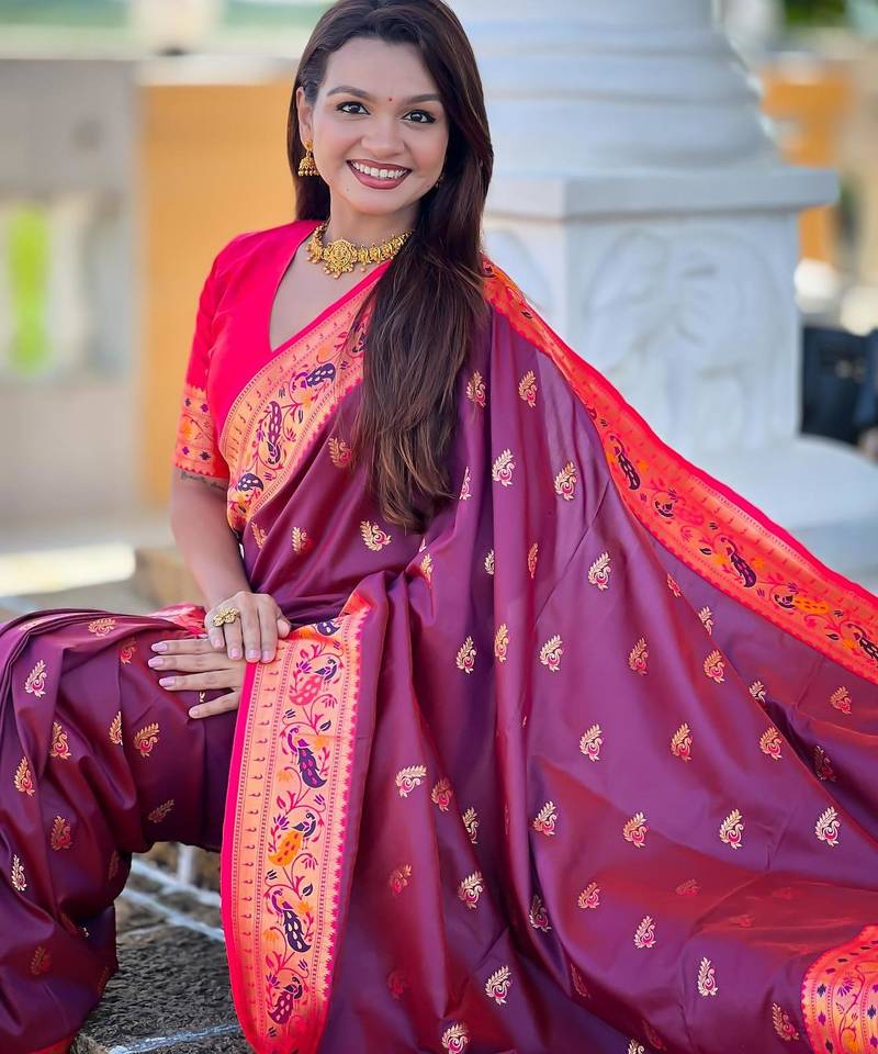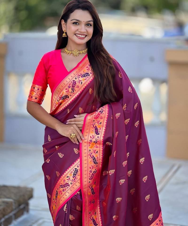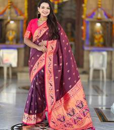 Wine elegant art silk woven saree with rich zari border