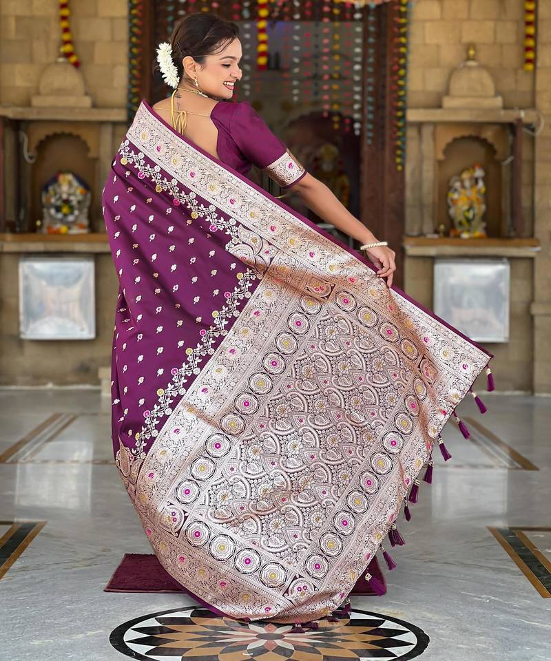 | Product Description | Soft Banarasi Silk Saree With Zari Weaving Meenakari Touchup Design All Over The Saree & Meenakari Weawing Rich Pallu With Meenakari Weawing Border & Tessels Attached At Pallu End. Blouse : Soft Silk Weawing Blouse Piece |