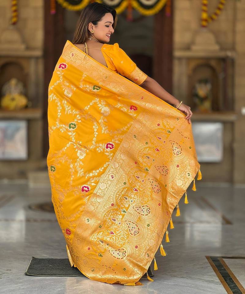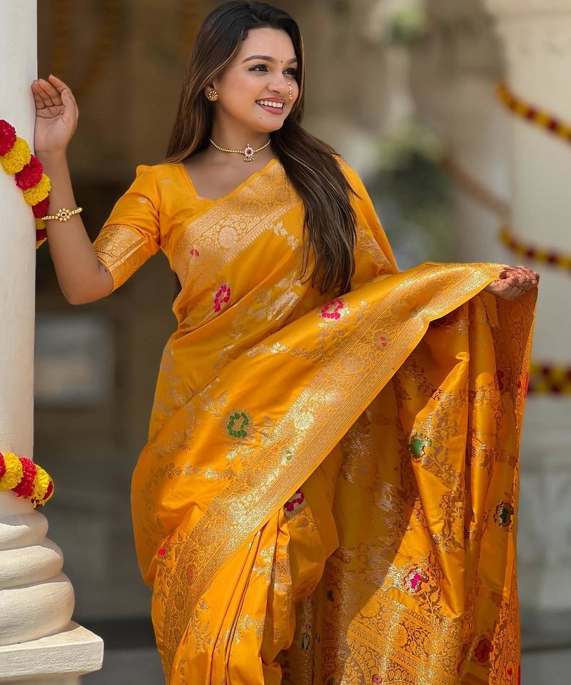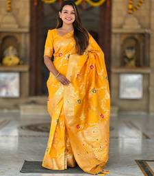 Yellow elegant art silk woven saree with rich zari border