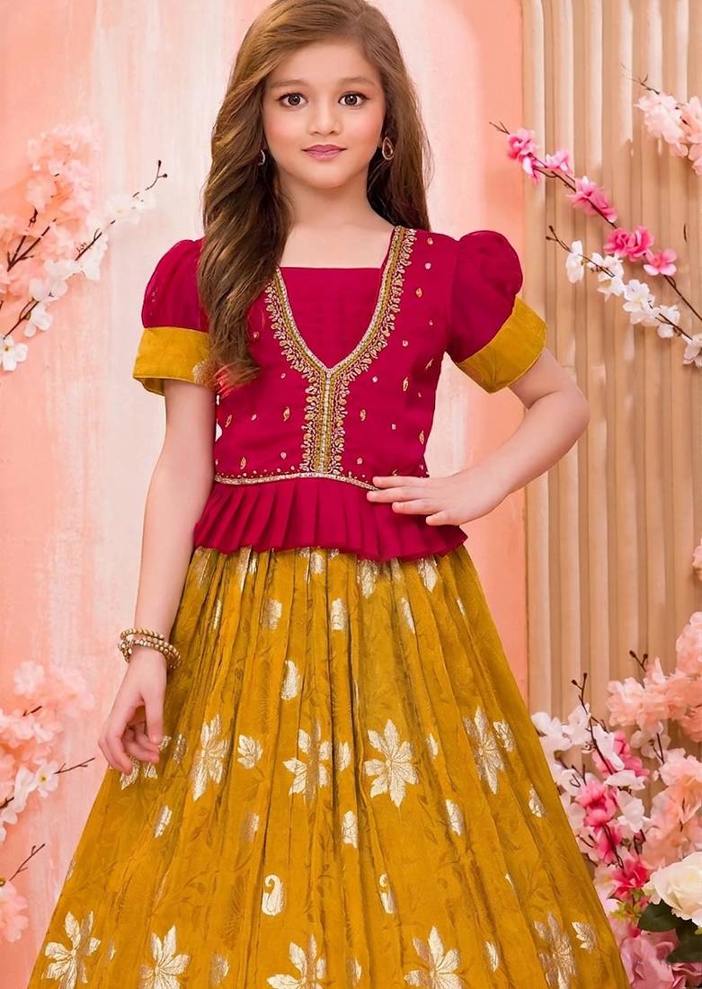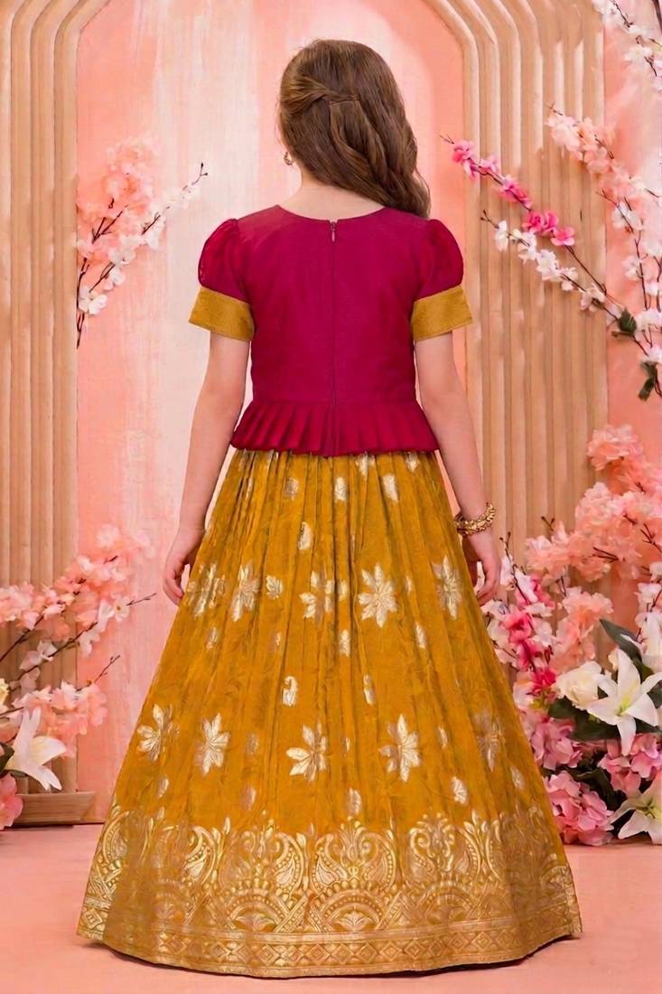 girls rani pink & mustard silk peplum lehenga choli set with gold zari work
