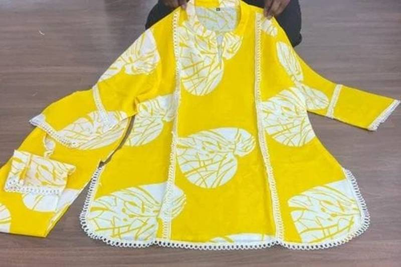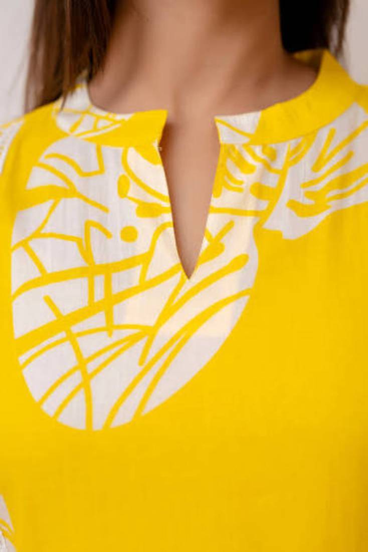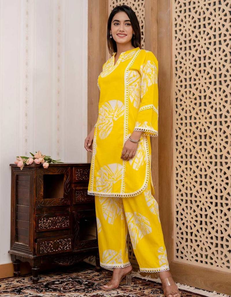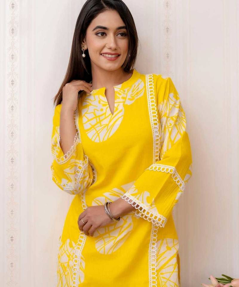 | Product Description | Add A Fresh And Vibrant Touch To Your Ethnic Collection With This Beautiful Yellow Kurta Pant Set For Women. Crafted From Soft And Breathable Rayon Fabric, This Outfit Ensures Maximum Comfort While Keeping Your Style On Point. The Straight Cut Kurti Features A Modern Neckline With Eye Catching Abstract Leaf Prints And Elegant Lace Detailing Along The Panels And Sleeves, Giving It A Premium And Trendy Look. The Bright Yellow Color Enhances Your Overall Appearance, Making It Perfect For Daytime Outings And Summer Wear. Paired With Matching Printed Palazzo Pants, This Set Offers A Relaxed And Flattering Fit, Ideal For All Day Wear. Whether You're Heading To Work, A Casual Meet Up, Or A Festive Gathering, This Outfit Is A Perfect Choice. Style It With Minimal Accessories And Heels Or Flats For A Chic Ethnic Look. |