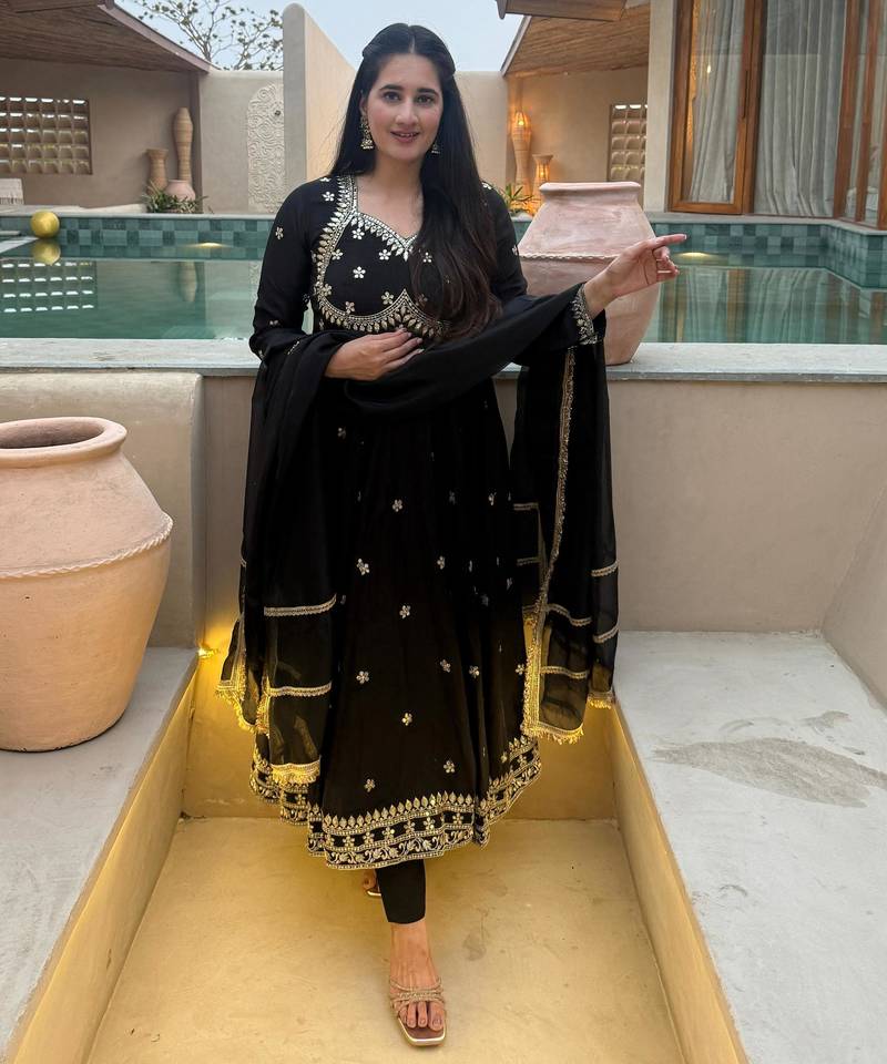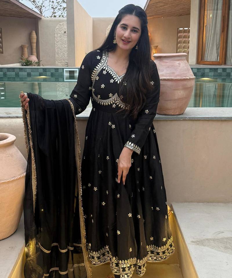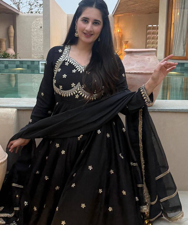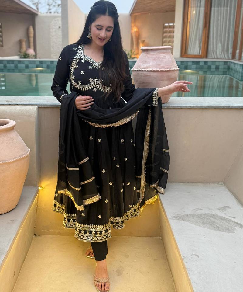 Black vichitra silk party wear embroidery anarkali suit set stitched