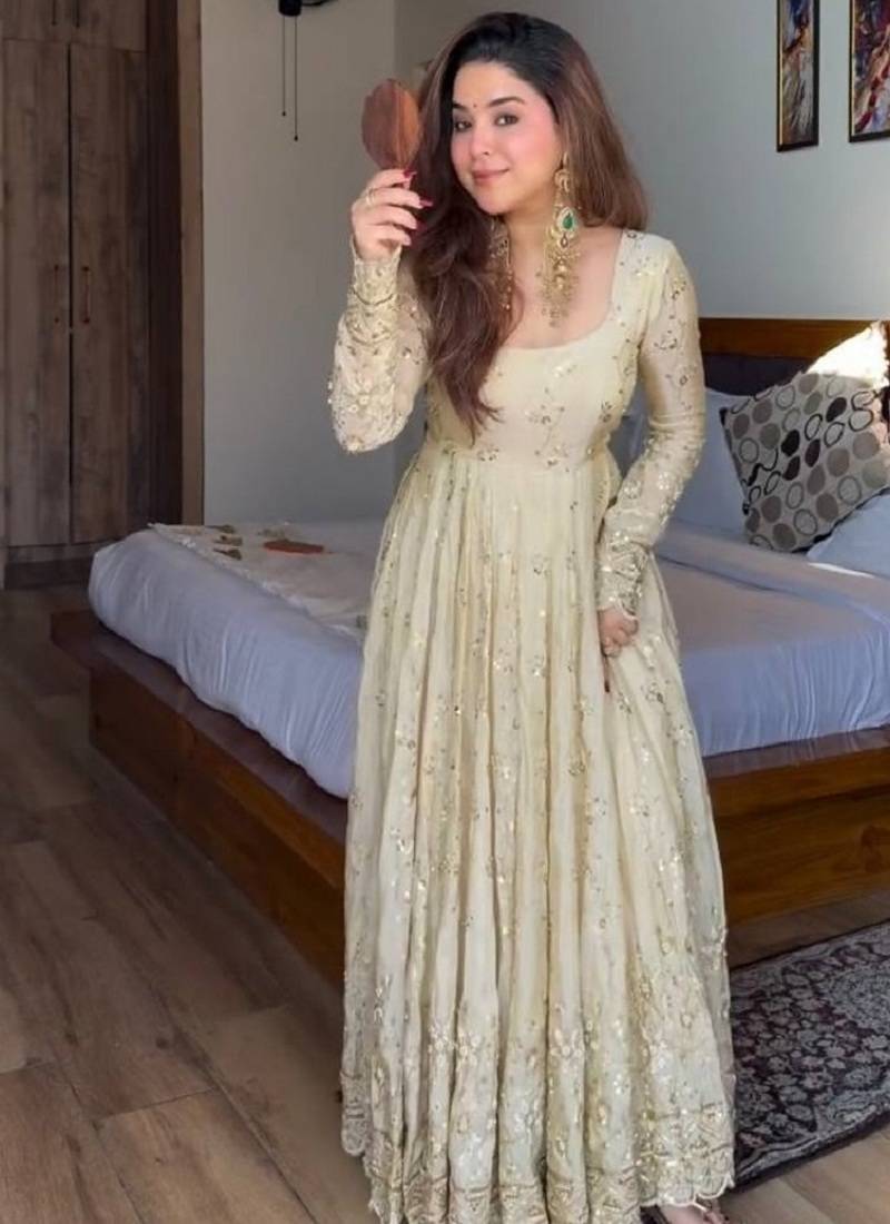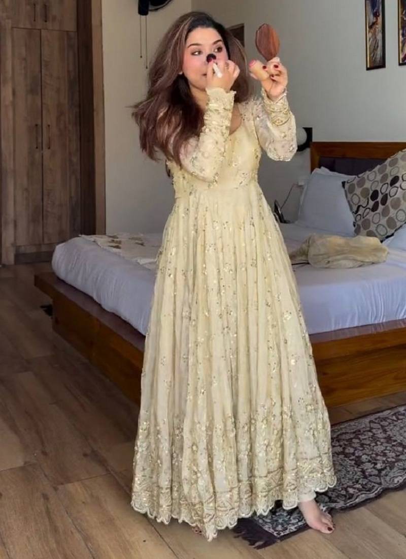 Cream chinon silk party wear embroidery anarkali suit set stitched