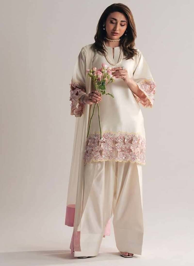 Off white creap silk party wear embroidery suit set stitched
