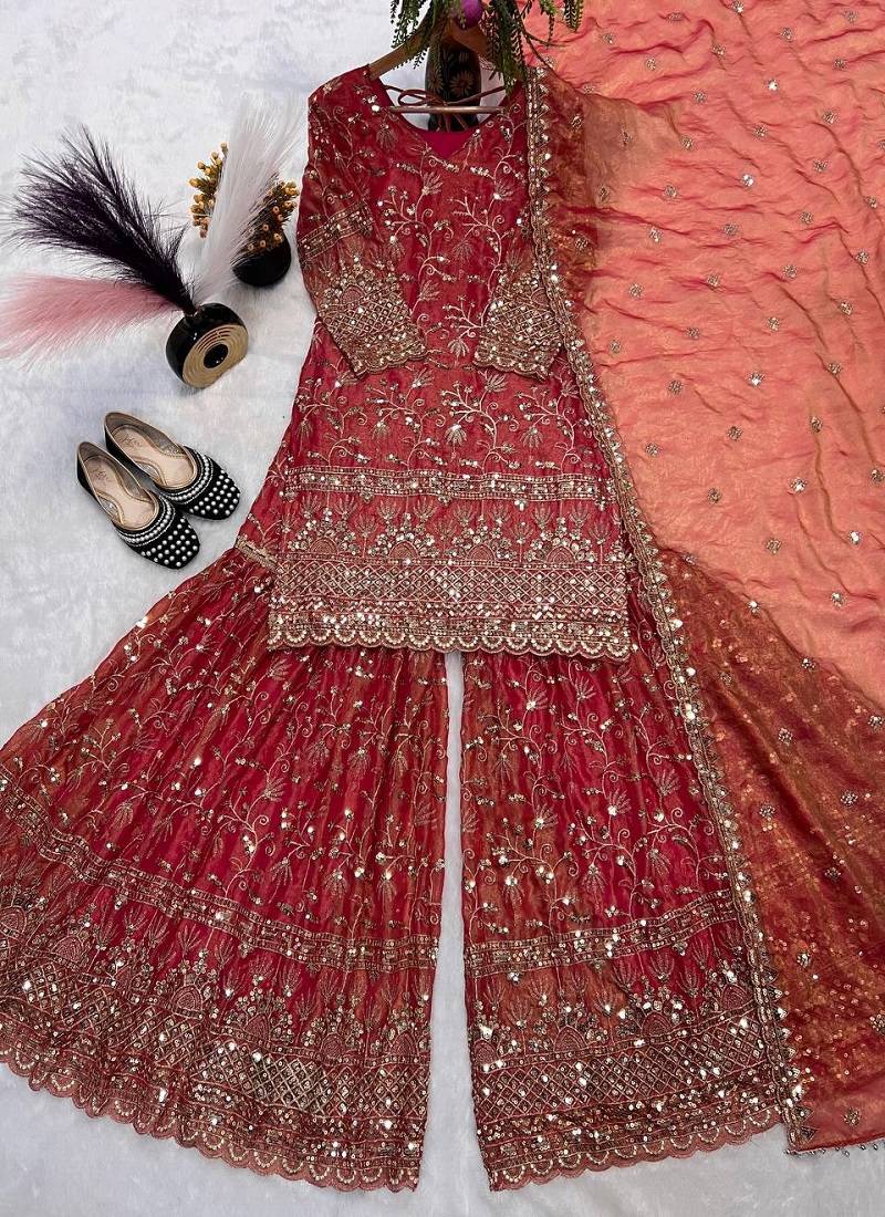 Orange fandy crushi silk party wear embroidery sharara suit set stitched