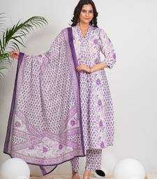 Women's Cotton Calf Length 3/4th Sleeve V Neck Floral Printed Anarkali Kurta With Printed Pant & Dupatta