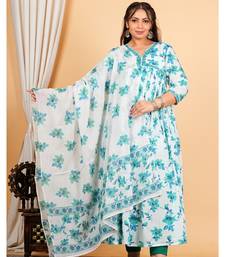 women's cotton floral printed 3::4th sleeve v-neck embroidered work anarkali kurta with dupatta