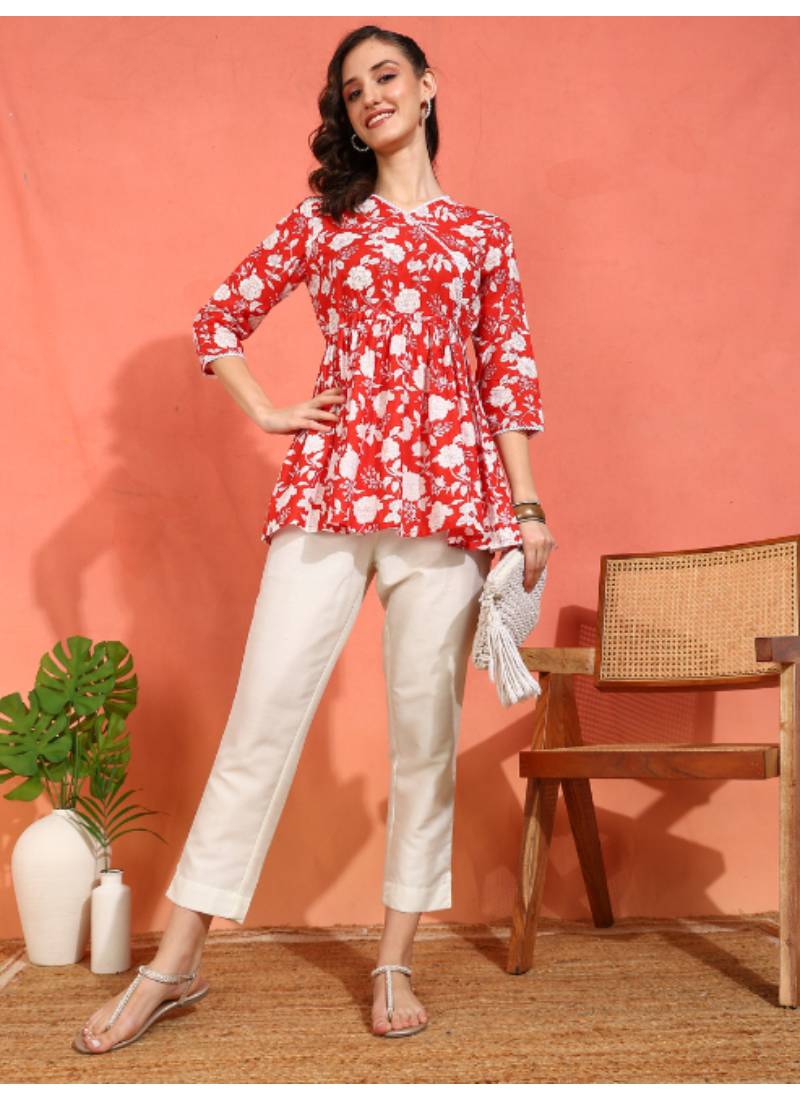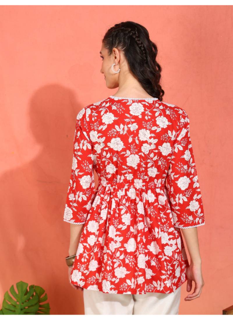 Step Into Effortless Elegance With Our Yash Gallery Women's Cotton Floral Printed Short Kurti, Designed To Complement The Modern Woman’s Wardrobe. Made From 100% Premium Cotton, This Kurti Is Not Only Soft And Breathable But Also Lightweight, Ensuring Comfort Throughout The Day. The Striking Red Color, Adorned With Delicate Floral Prints, Encapsulates The Essence Of Feminine Charm And Vibrancy. With Its Flattering V Neck And Chic 3/4th Sleeves, It Offers The Perfect Blend Of Traditional Aesthetics And Contemporary Style. The Unique Peplum Cut, Mid Thigh Length, Adds A Playful Flair, Making It An Ideal Choice For Casual Outings Or Festive Occasions. What Sets This Kurti Apart Is Its Exquisite Lace Work That Beautifully Accents The Hemline, Giving It A Sophisticated Edge That’s Hard To Resist. Whether You Are Heading To A Brunch With Friends, Attending A Family Gathering, Or Simply Enjoying A Day Out, This Versatile Piece Can Be Styled In Countless Ways. Pair It With Your Favorite Leggings, Palazzo Pants, Or Denims For A More Casual Look—It's The Ultimate Wardrobe Staple That Transitions Effortlessly From Day To Night. Caring For Your Yash Gallery Kurti Is As Easy As Wearing It. Simply Hand Wash In Cold Water And Hang To Dry To Maintain Its Vibrant Colors And Fabric Quality. Each Piece Is Handcrafted With Love And Attention To Detail. Elevate Your Style Quotient With This Stunning Floral Printed Kurti That Celebrates Individuality And Elegance. Add It To Your Collection Today And Experience The Beauty Of Handcrafted Fashion!