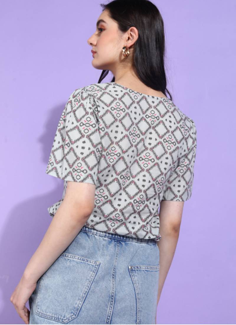 Yash Gallery Women's Cotton Geometrical Print Waist Lengtth Square Neck Short Sleeves Regular Fitted Top (Grey)