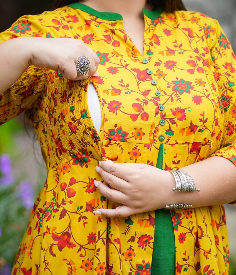 | Product Description | An Amazing Range Of Women Kurti In Soft And Solid Colors That Looks Perfect For Regular Wear. With Beautiful Designs And Patterns. These Apparels Are Very Stylish And Comfortable Too. Get Rid Of The 'regular' Look This Season Wearing Kurti By Yash Gallery. With A Perfect Blend Of Comfort And Traditional Style, This Mustard Stretchable Floral Printed Maternity Wear Dress From Yash Gallery Exhibits With Consealed Zipper, Smoking Embroidery, Buttons. Tailored From Cotton. Product Length: 48 Inch |