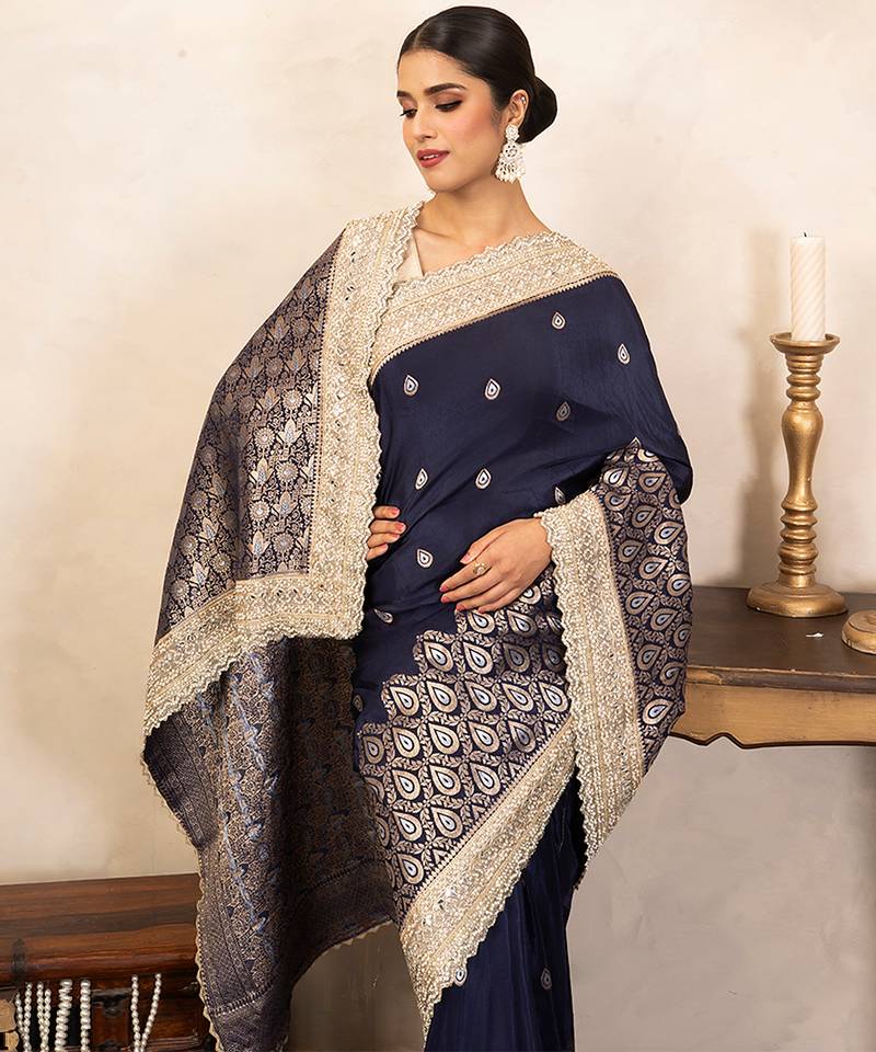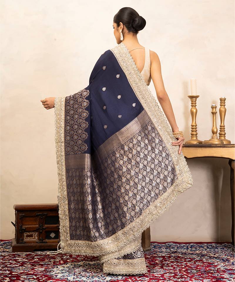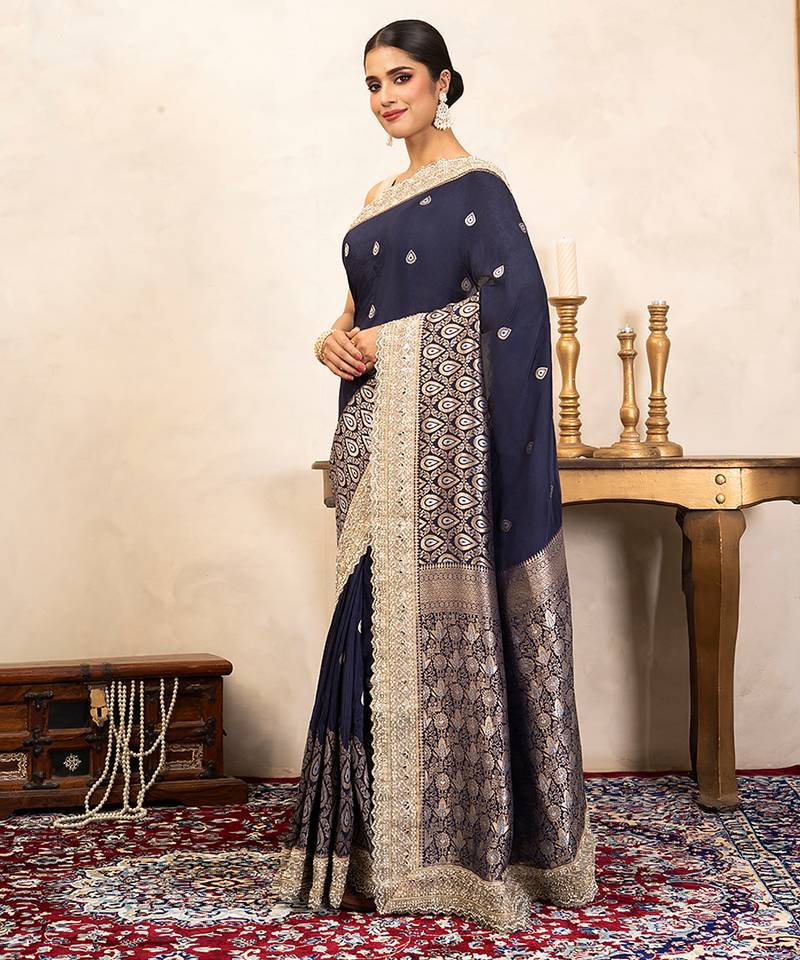 | Product Description | This Navy Blue Banarasi Silk Saree Highlights Exquisite Handwoven Patterns That Reflect Heritage Craftsmanship. Its Rich Texture And Graceful Drape Make It Perfect For Weddings And Celebrations. Style It With Classic Accessories To Create A Sophisticated And Timeless Ensemble Effortlessly.