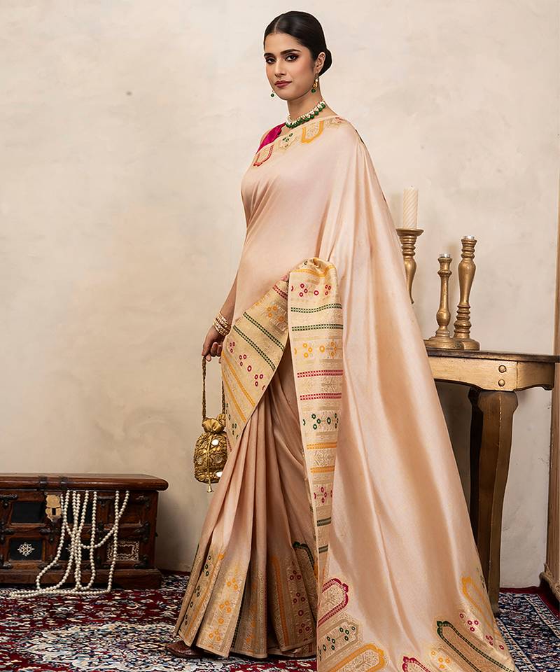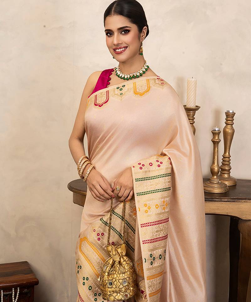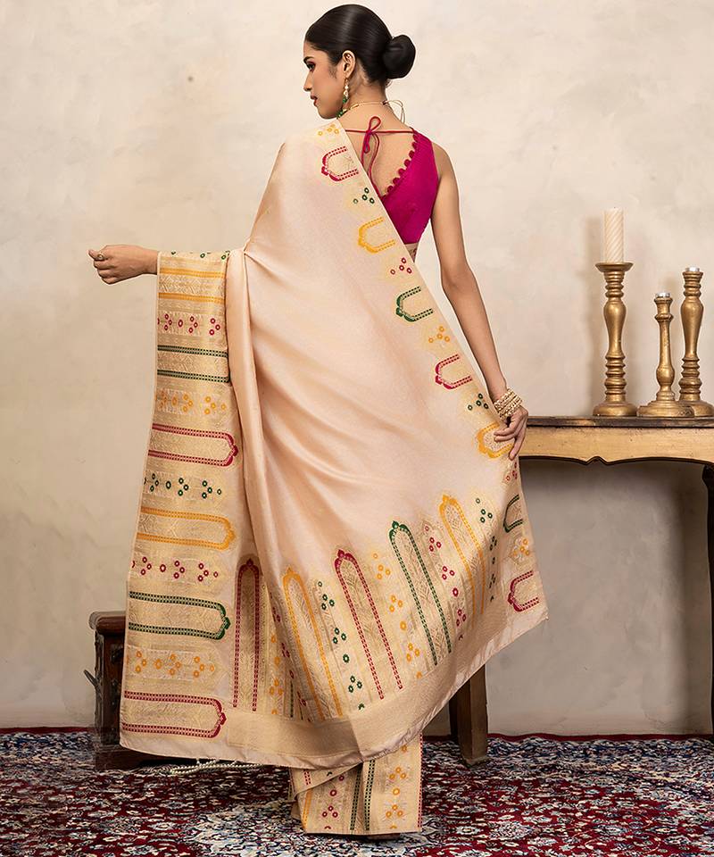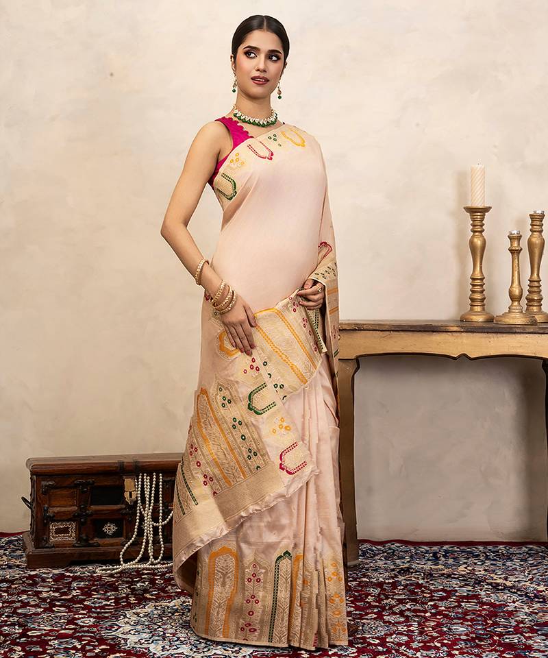 | Product Description | This Off White Banarasi Silk Saree Showcases Intricate Handwoven Detailing That Enhances Its Subtle Elegance. Its Luxurious Texture And Graceful Drape Make It Perfect For Festive Occasions. Pair It With Traditional Jewelry For A Timeless And Refined Look That Reflects Heritage Craftsmanship Beautifully.