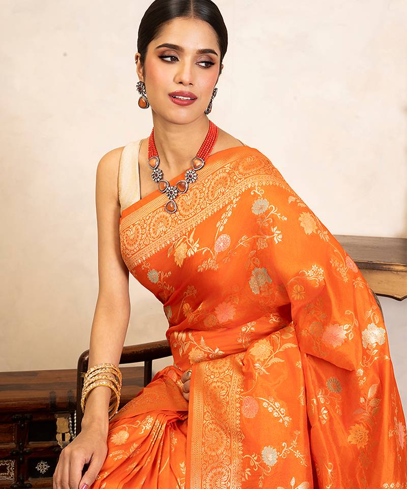 | Product Description | This Orange Banarasi Silk Saree Showcases Vibrant Charm With Intricate Handwoven Motifs. Its Rich Texture And Elegant Drape Make It Ideal For Festive Celebrations. Style It With Traditional Jewelry To Create A Bold, Radiant Look That Reflects Timeless Elegance And Cultural Heritage Beautifully.