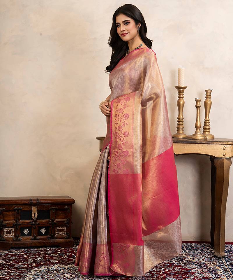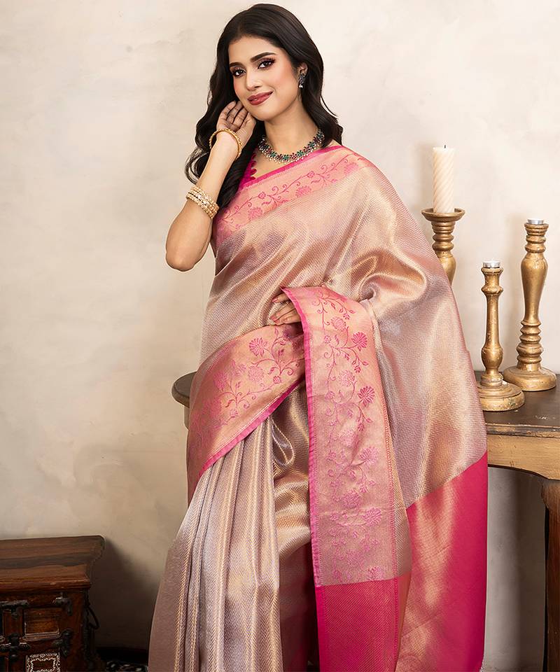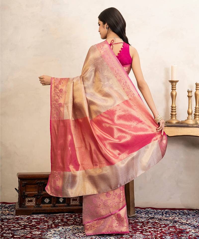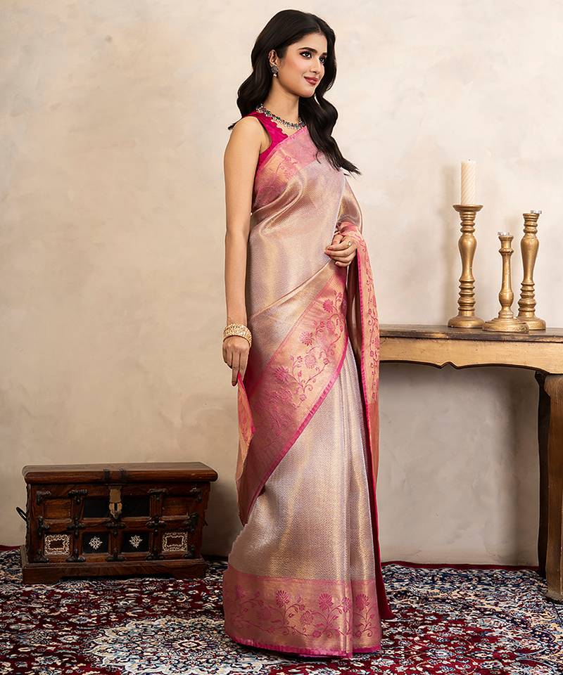 | Product Description | This Pink Kanchipuram Silk Saree Showcases Traditional Handwoven Craftsmanship With Intricate Patterns And A Rich Texture. Its Structured Drape Adds Grandeur, Making It Ideal For Weddings And Celebrations. Style It With Classic Gold Jewelry To Achieve A Regal And Timeless Look Full Of Elegance.