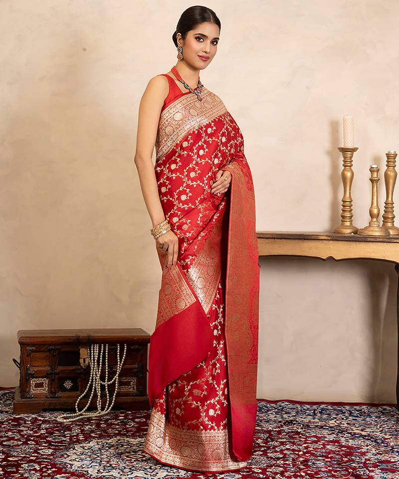 | Product Description | This Red Banarasi Silk Saree Features Intricate Handwoven Patterns That Reflect Heritage Craftsmanship. Its Rich Texture And Vibrant Hue Make It Ideal For Weddings And Celebrations. Style It With Traditional Jewelry For A Regal, Timeless Look Full Of Elegance And Cultural Beauty.