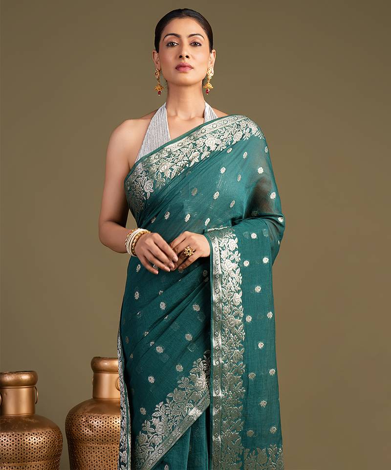 | • | Saree | : | Color- Teal / Fabric- Pure Silk |